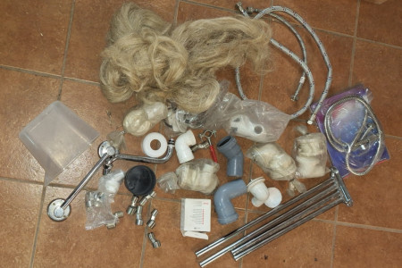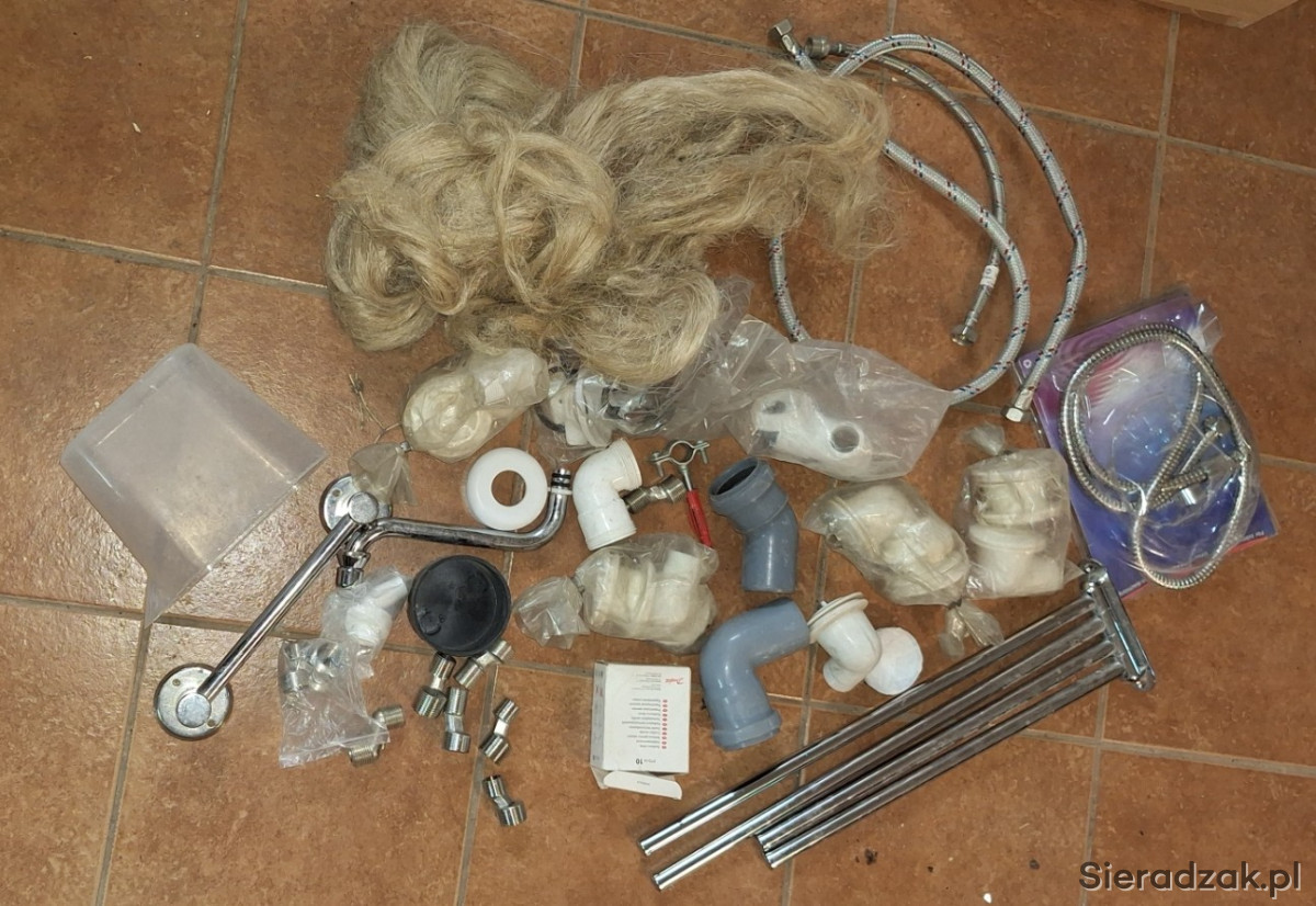 Zestaw różnych części hydraulicznych, które są pozostałościami po pracach instalacyjnych lub budowlanych. Elementy te są powszechnie stosowane przy montażu baterii łazienkowych, zlewozmywaków oraz instalacji wodno-kanalizacyjnych.