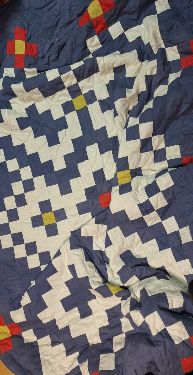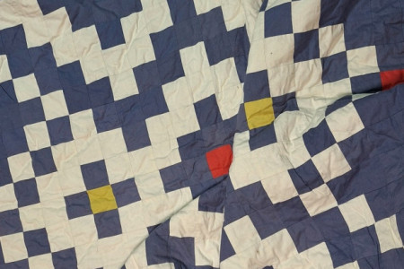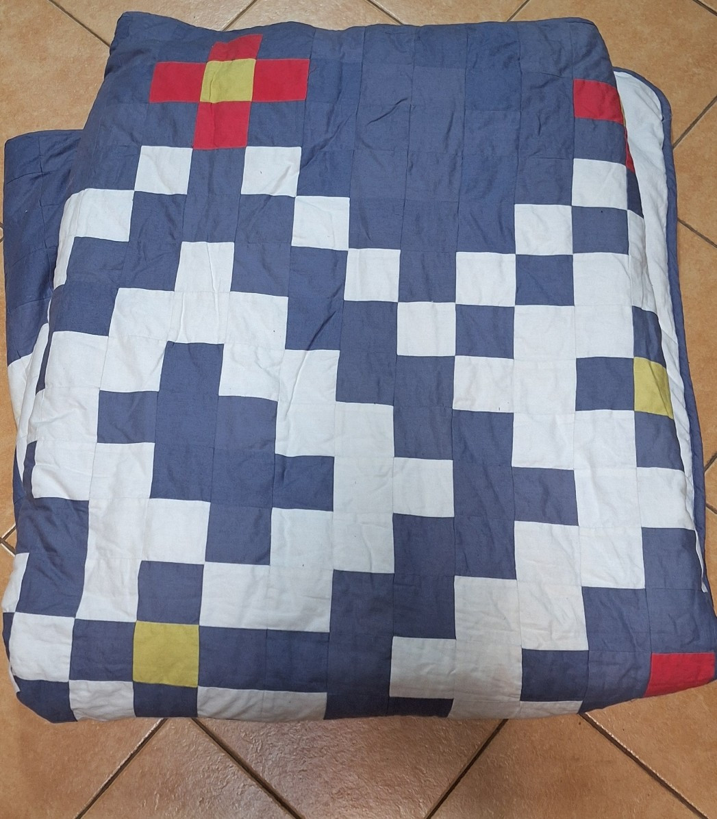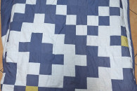 Narzuta w stylu nowoczesnego patchworku z geometrycznymi motywami pikselowymi w kolorach niebieskim, białym, czerwonym i żółtym.