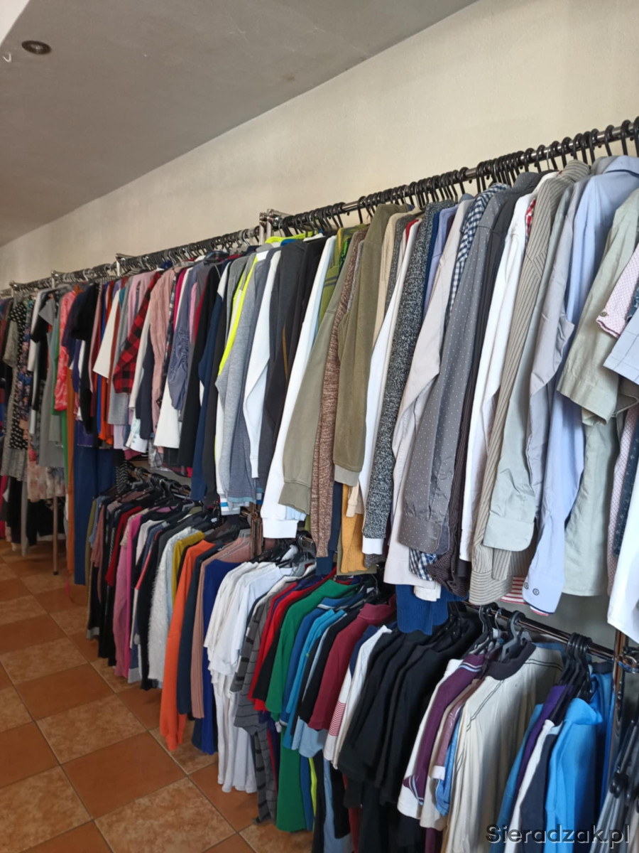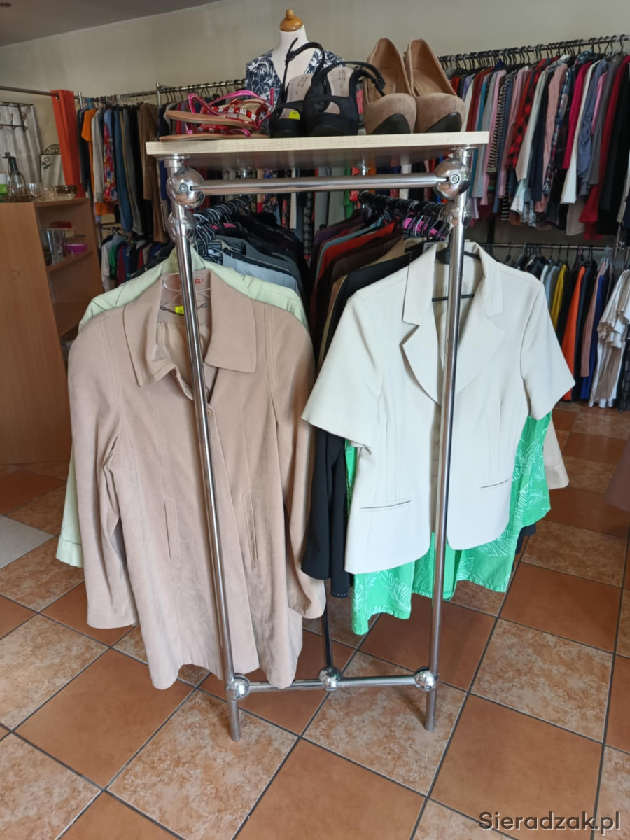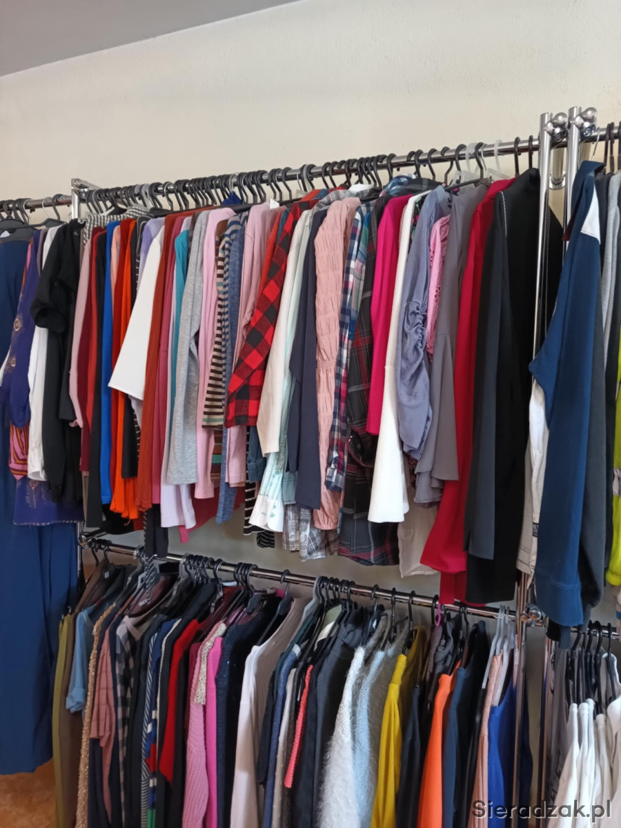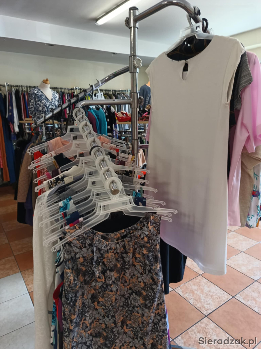 Dwa dwustronne stojące wieszaki z deską u góry, wieszak mocowany do ściany długość 5m+ 1,5m przymierzalnia, wieszak obrotowy wolnostojący, dorzucam metalową kasę i kilka rzeczy pozostałych po sklepie przydatnych na start. posiada też spor ilości wieszaków plastikowych obrotowych. Istnieje możliwość wystawienia rachunku