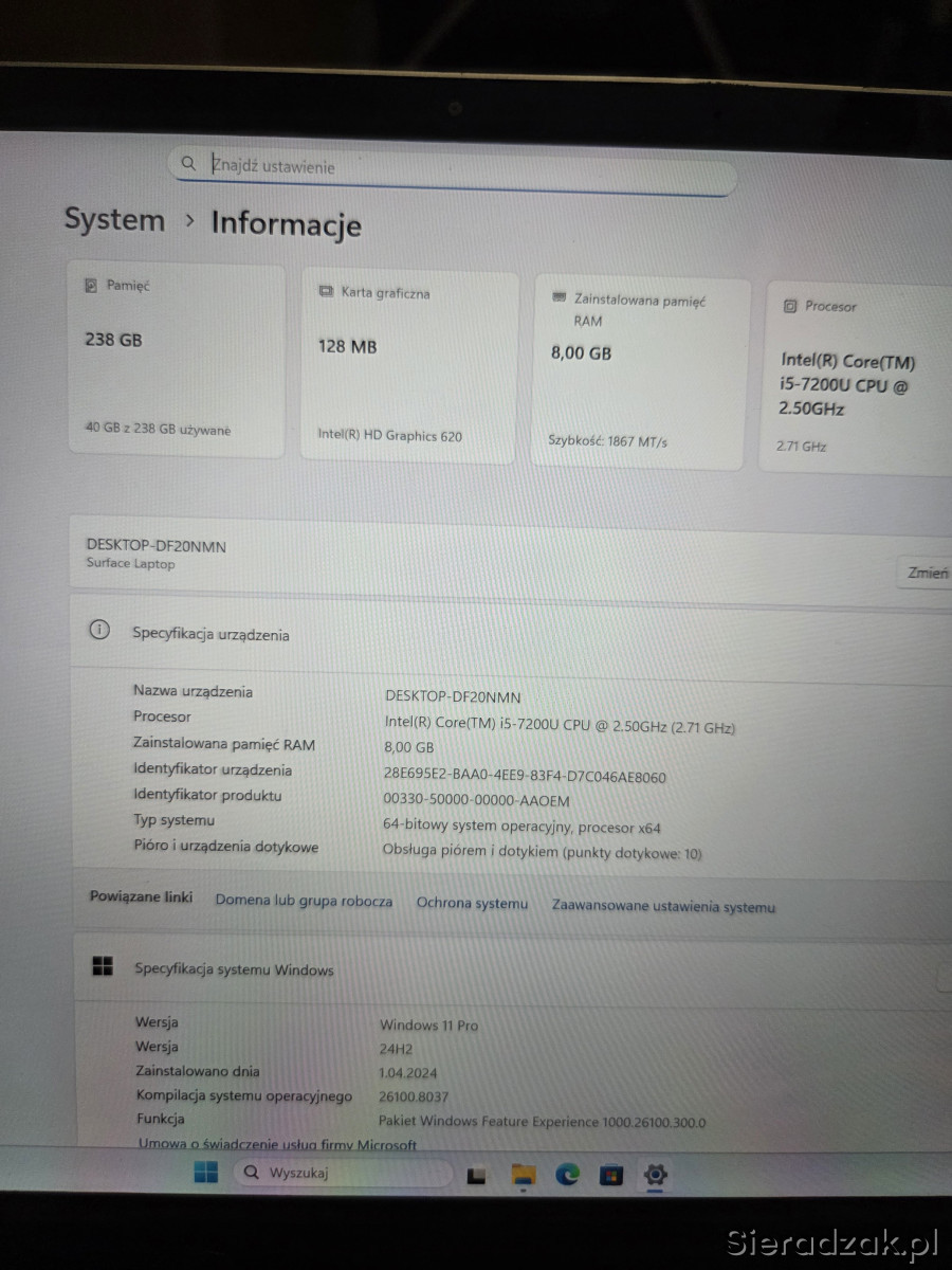 Na sprzedaż posiadam notebooka dotykowego Microsoft Surface Laptop, na procesorze i5-7gen,