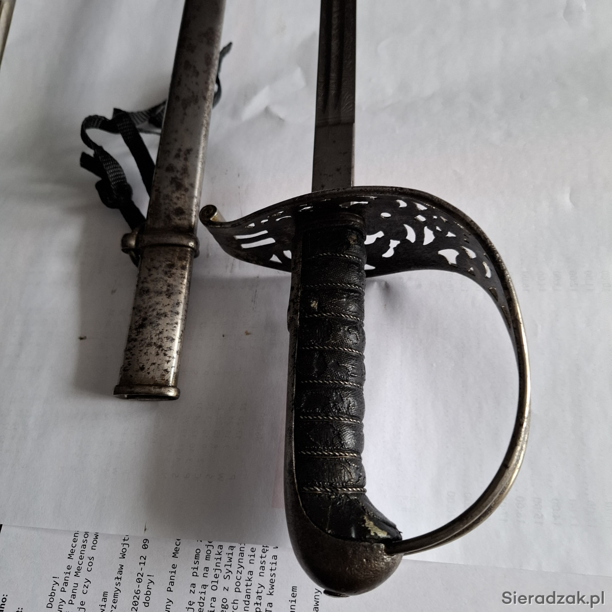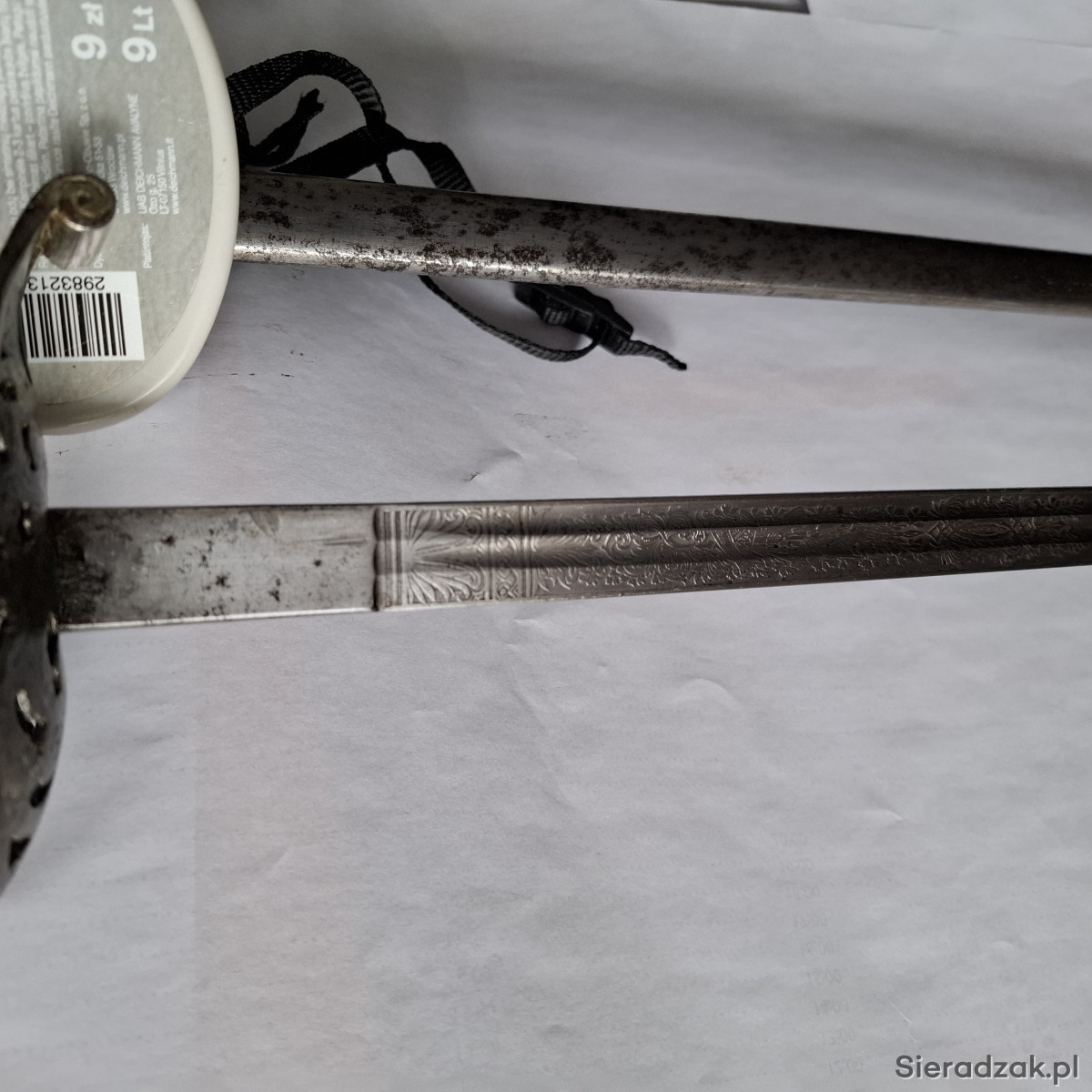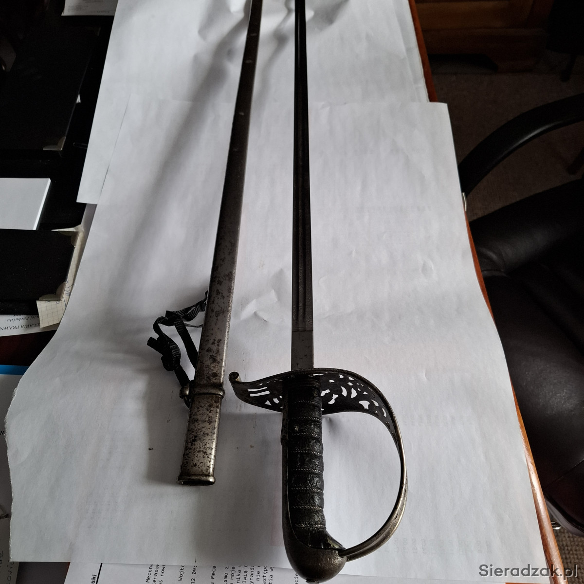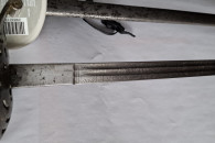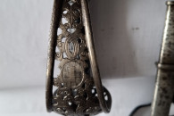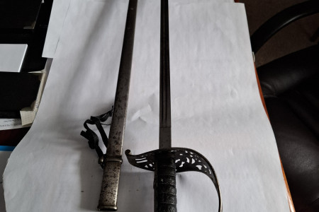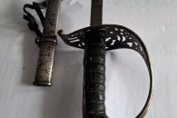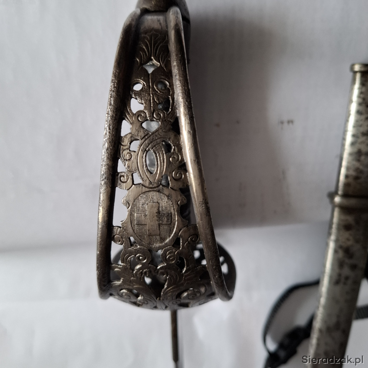 Pałasz model 1899. Głownia dwustronnie zdobiona panopliami. Między panopliami i na ozdobnej rękojeści krzyże równoramienne herb Szwajcarii. Sygnowanie na zastawie głowni. Długość pałasza w pochwie - 100 cm.