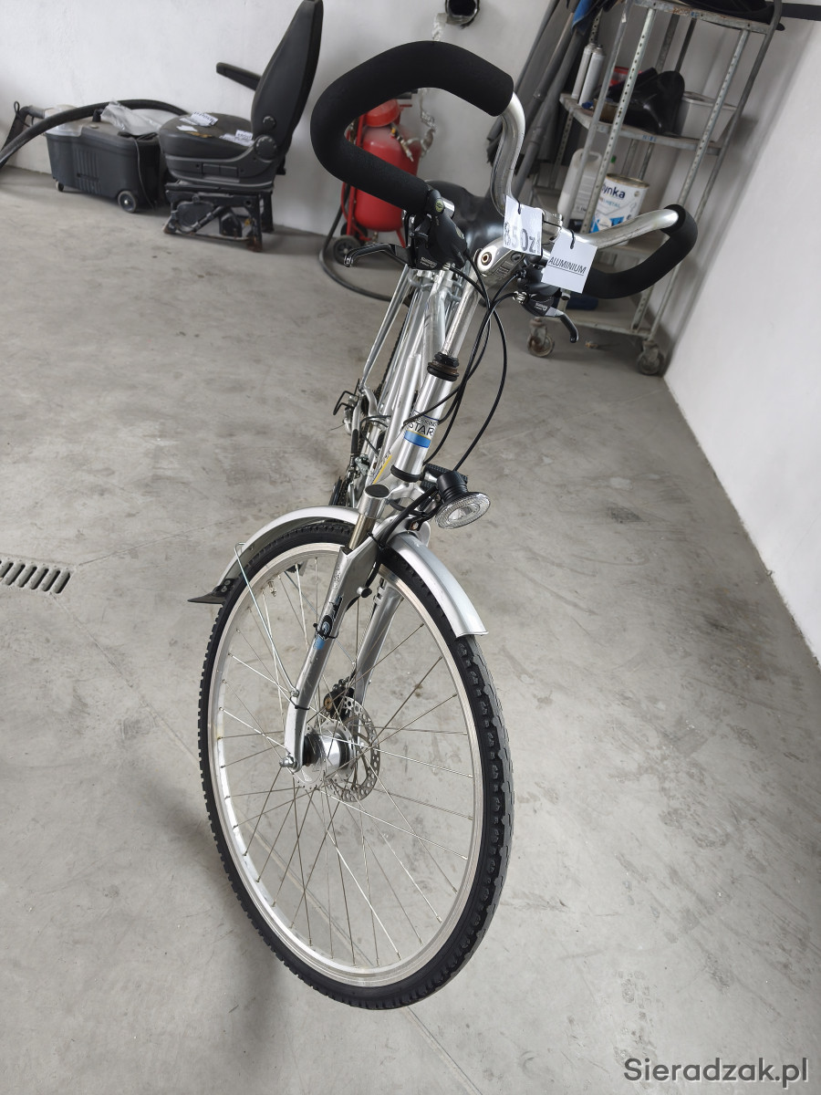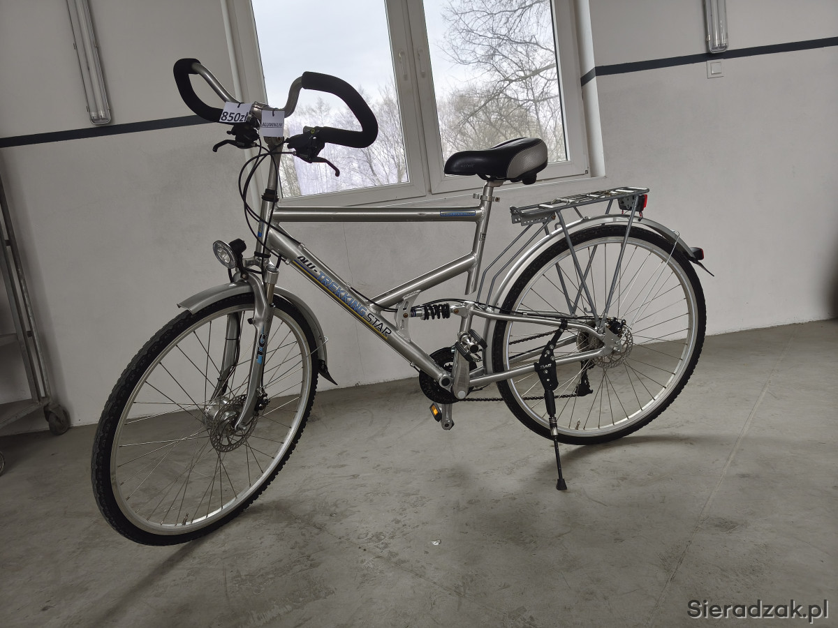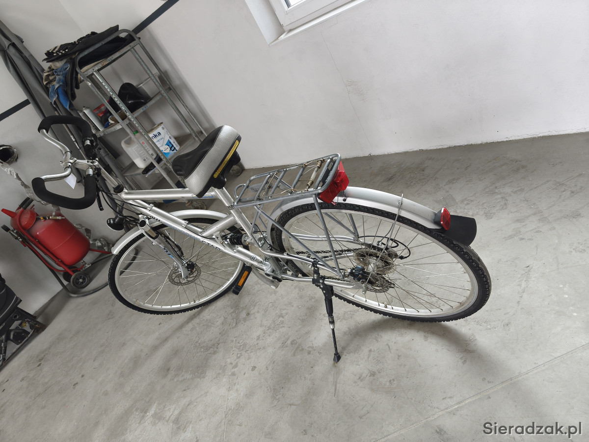 Amortyzowany przedni widelec, amortyzowana, aluminiowa rama, hamulce tarczowe SHIMANO V-BRAKE. Przerzutki 3x8. Sprawne oświetlenie, prądnica w przedniej piaście.