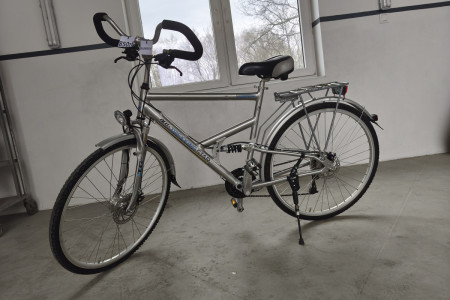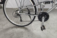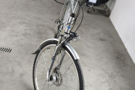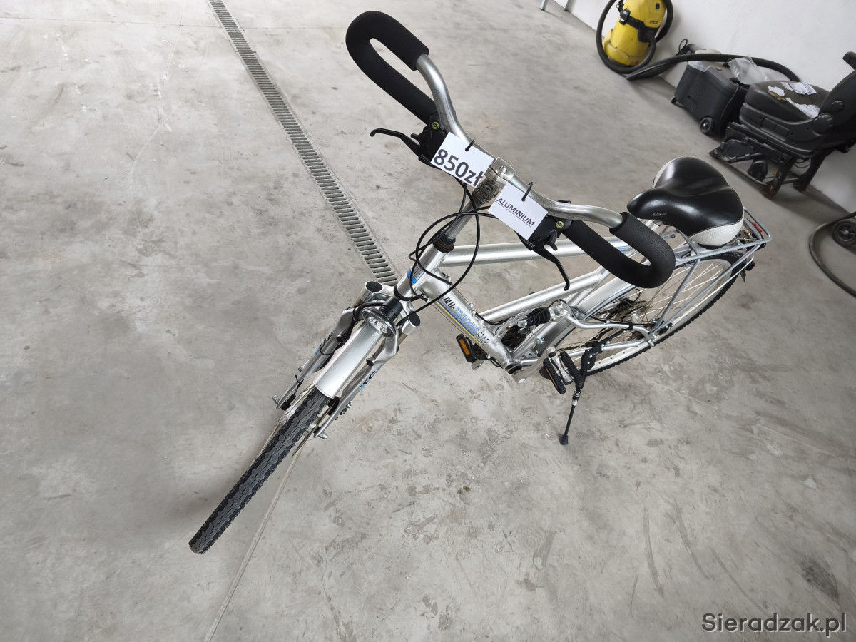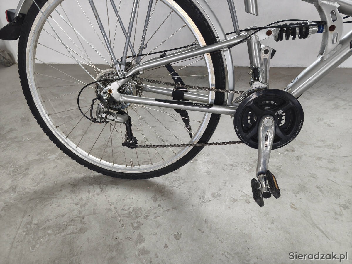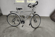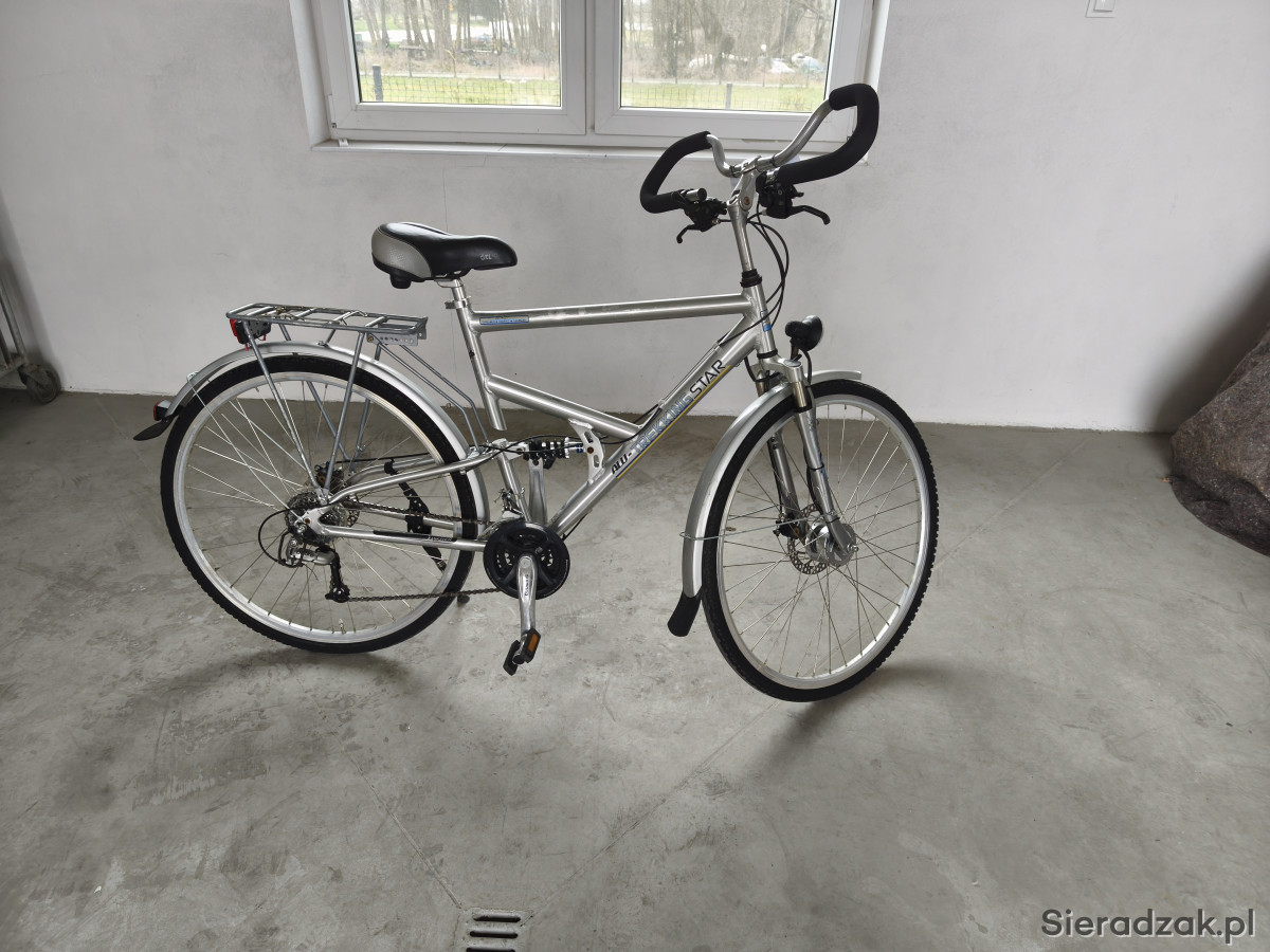 Amortyzowany przedni widelec, amortyzowana, aluminiowa rama, hamulce tarczowe SHIMANO V-BRAKE. Przerzutki 3x8. Sprawne oświetlenie, prądnica w przedniej piaście.