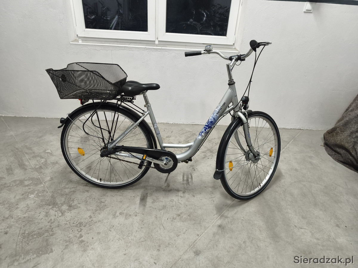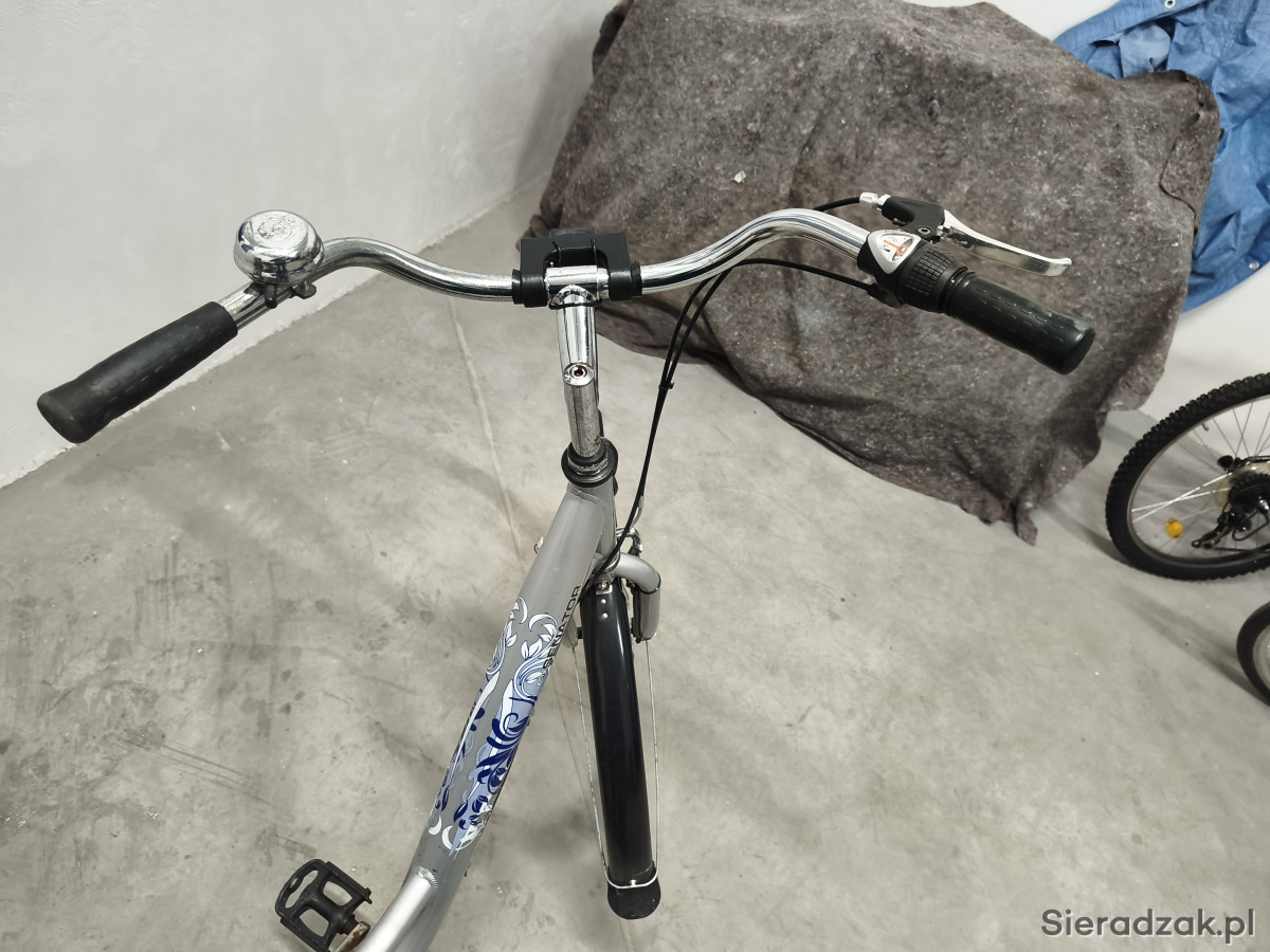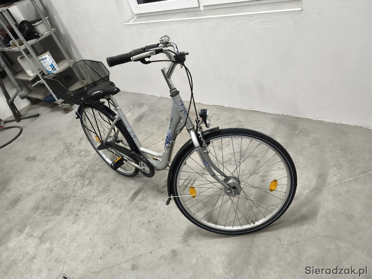 3 biegi, rama aluminiowa, dynamo (prądnica) w przedniej piaście. Działające oświetlenie.