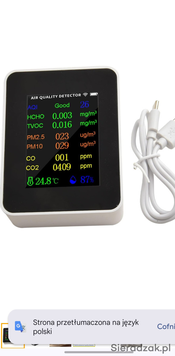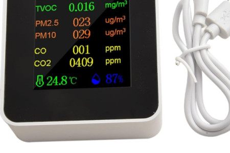 Detektor jakości powietrza z wyświetlaczem LCD, który pokazuje różne parametry powietrza, takie jak stężenie PM2.5, PM10, CO2 oraz temperaturę i wilgotność. Urządzenie jest nowe, kompaktowe i łatwe w użyciu.