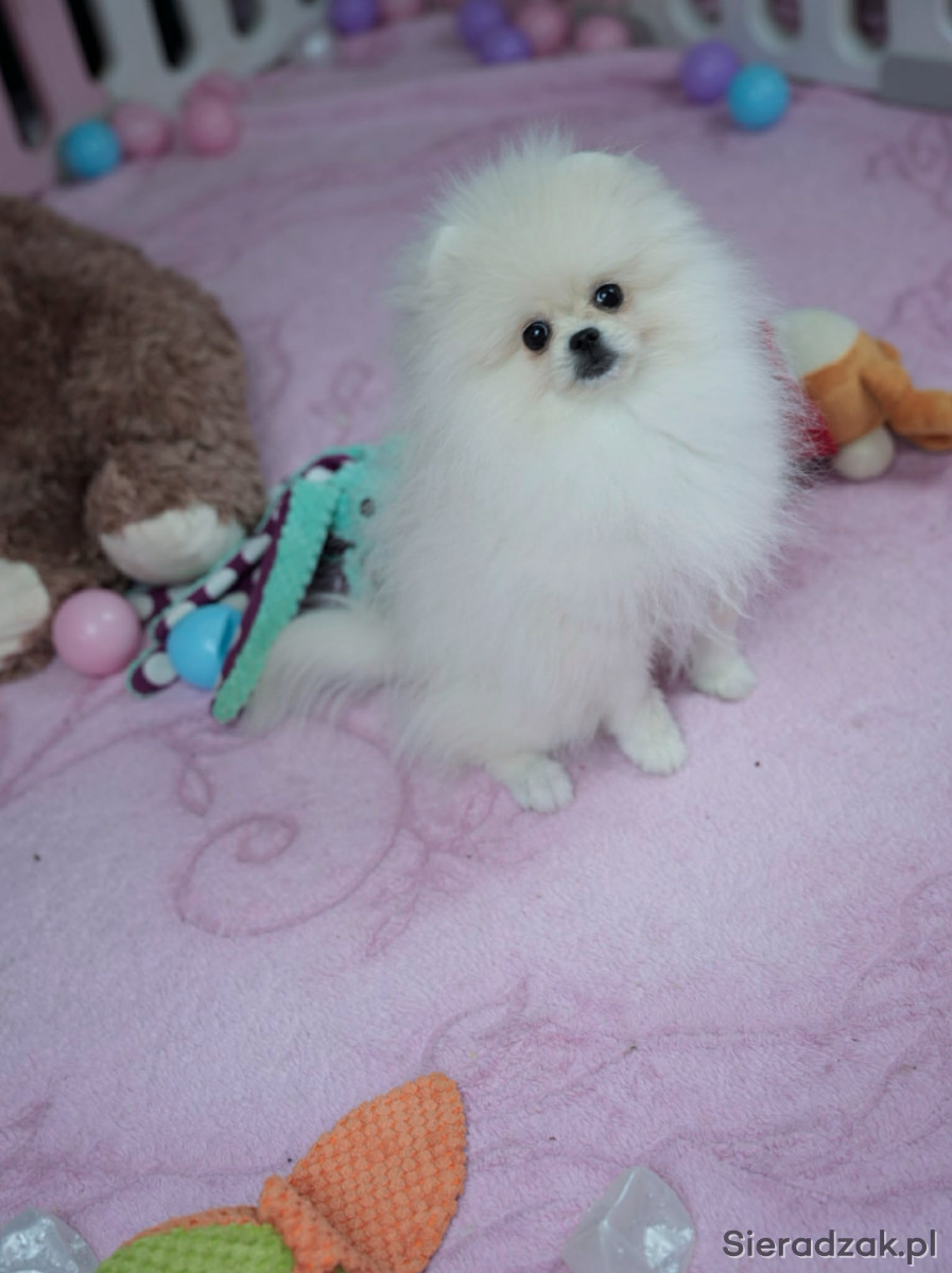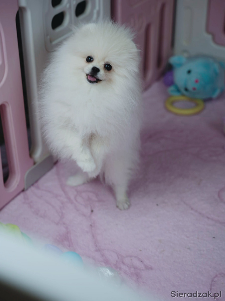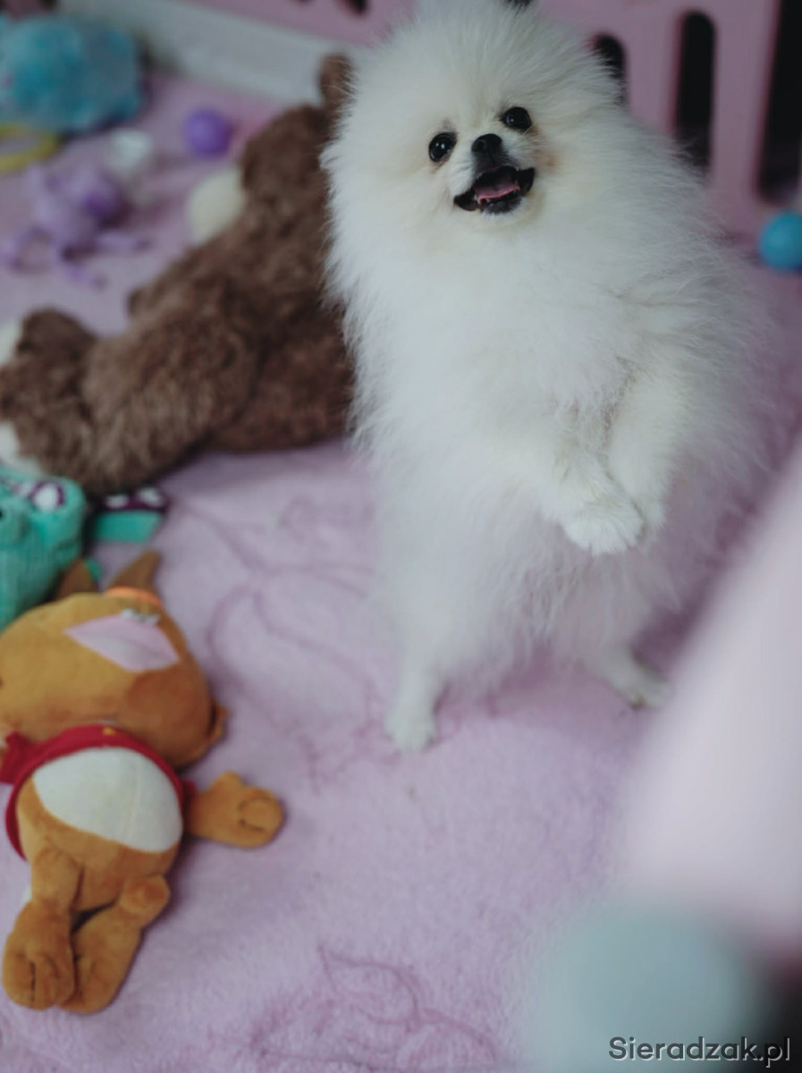 Oferuję przepiękną suczkę rasy Pomeranian o śnieżnobiałym, gęstym futerku i idealnej, kompaktowej budowie.
