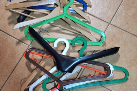 Zestaw różnorodnych wieszaków ubraniowych wykonanych z tworzywa sztucznego oraz drewna.