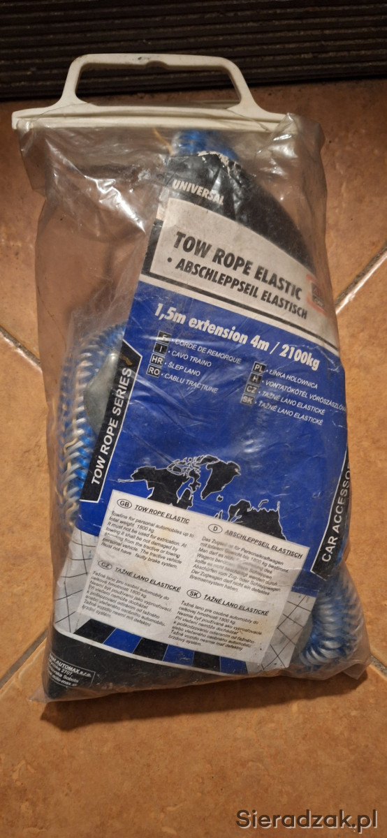 Elastyczna lina holownicza (marka Universal), przeznaczona do holowania pojazdów samochodowych.