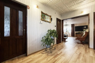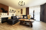 Dom składa się z przestronnego korytarza wraz z wnęką na szafę w zabudowie typu komandor - idealna opcja na odzież wierzchnią. Idąc dalej na wprost pokój, który obecnie służy jako gabinet oraz nowoczesna łazienka z toaletą, wyposażona w prysznic. W głównej części domu znajduje się duży salon z wyjściem na taras i kominkiem, połączony z jadalnią i półotwartą kuchnią. Kuchnia wraz z zabudową, wyposażona w nowoczesne sprzęty AGD.