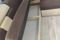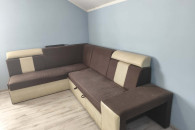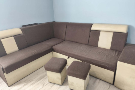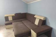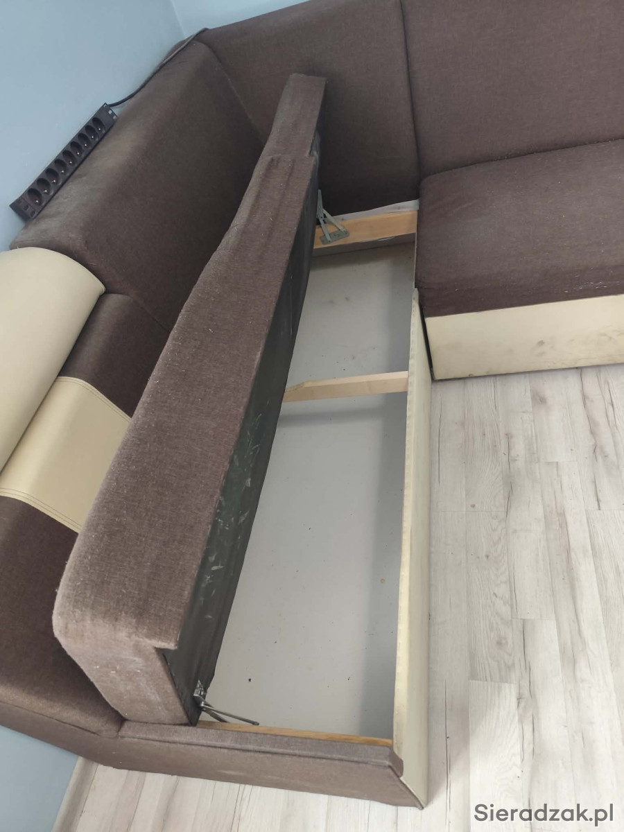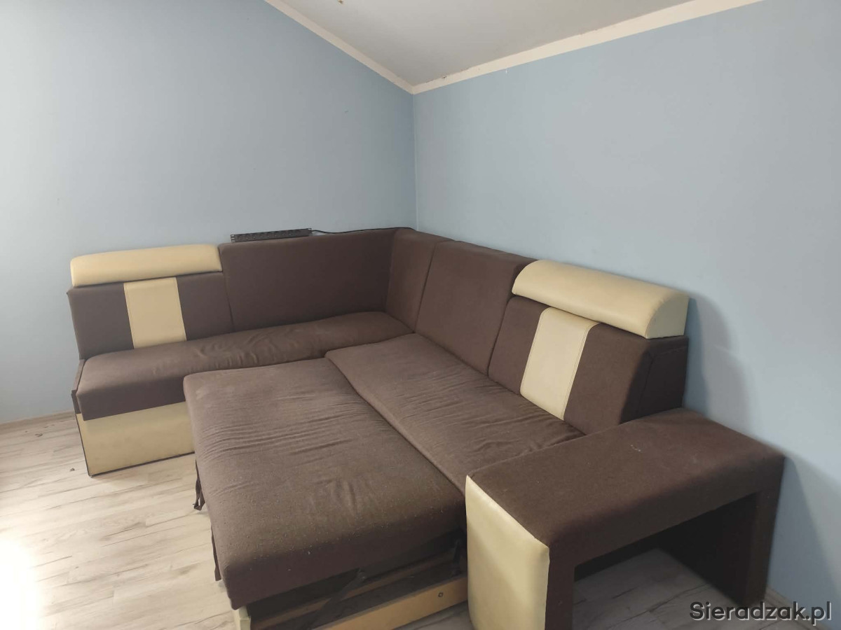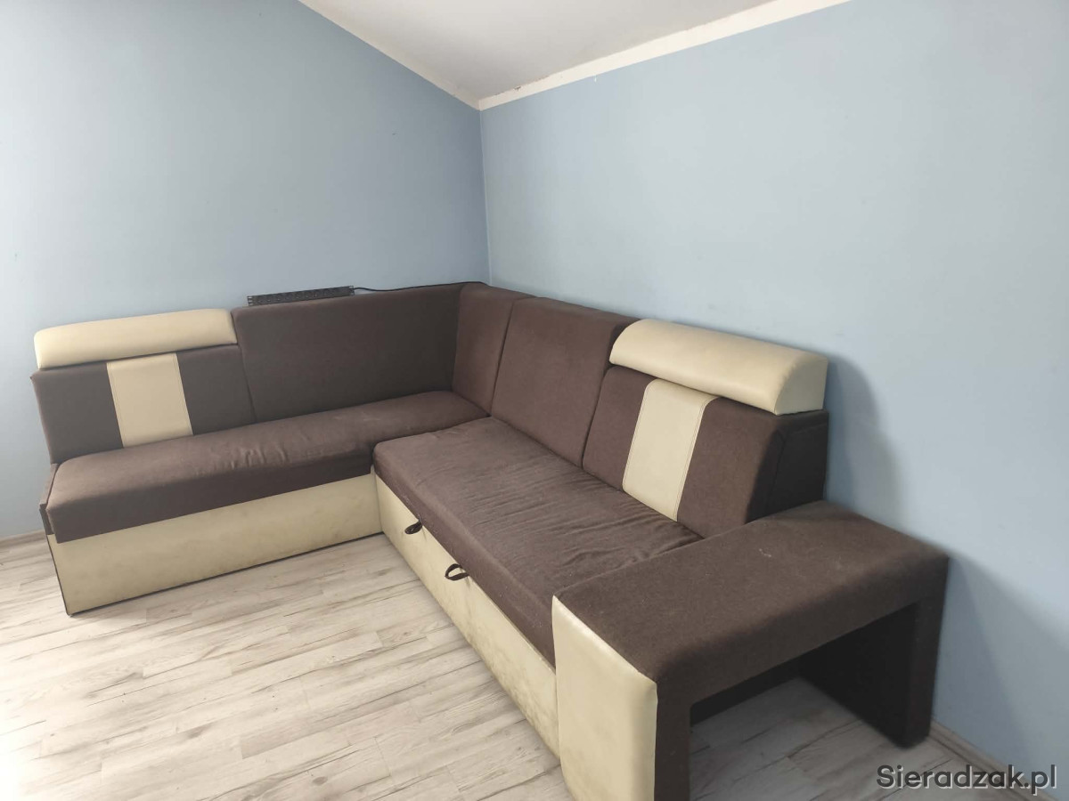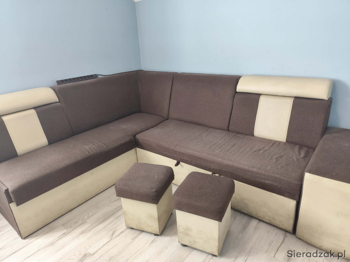 Sprzedam wygodną, używana narożną kanapę w brązowo-beżowym kolorze. Kanapa posiada funkcję spania oraz pojemnik na pościel, duża i w dobrym stanie. W zestawie również dwie pufy.