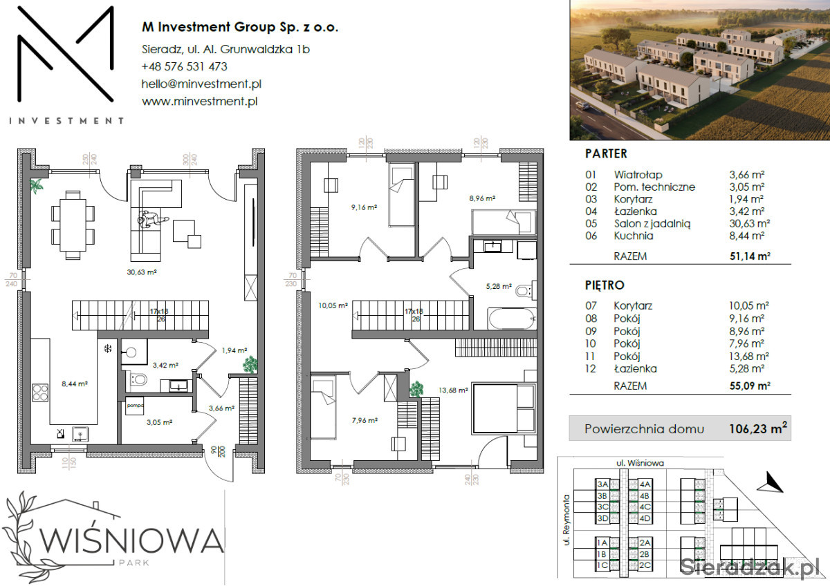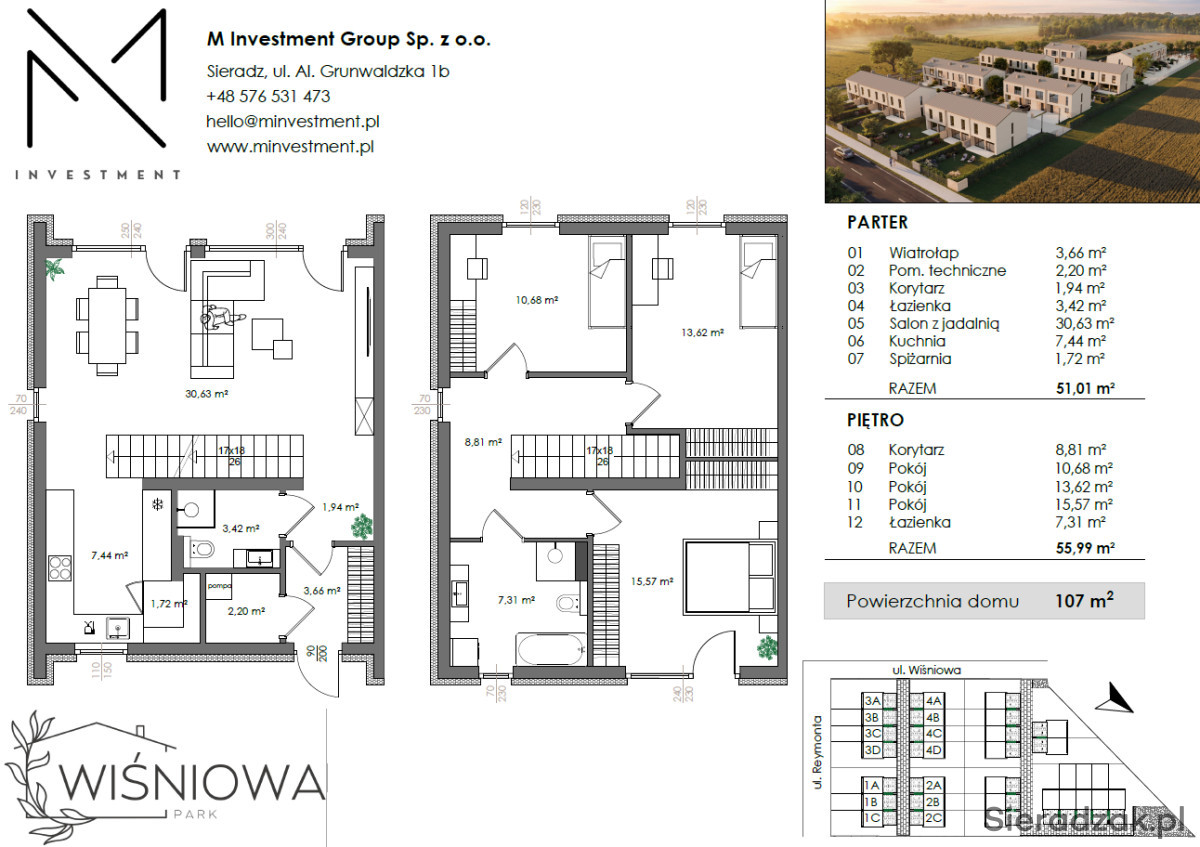 Wiśniowa Park to inwestycja składająca się z 28 energooszczędnych nowoczesnych domów jednorodzinnych w zabudowie szeregowej. Obecnie w sprzedaży dostępnych jest 6 domów o powierzchni użytkowej 107 m² – każdy z nich oferuje dwie pełne kondygnacje, bez skosów dachowych, co pozwala w pełni wykorzystać przestrzeń.