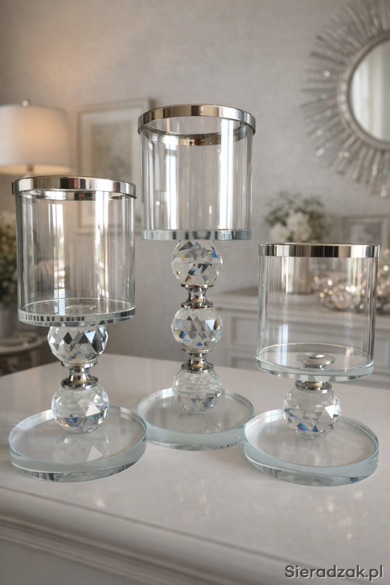 Zestaw składa się z 3 sztuk o różnych wysokościach – 12cm, 15cm i 20cm. Idealnie prezentują się razem na stole, komodzie lub konsoli. Dodają wnętrzu luksusowego charakteru