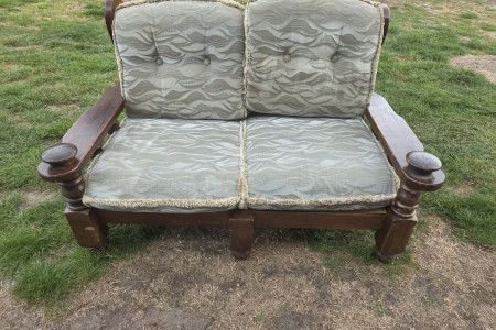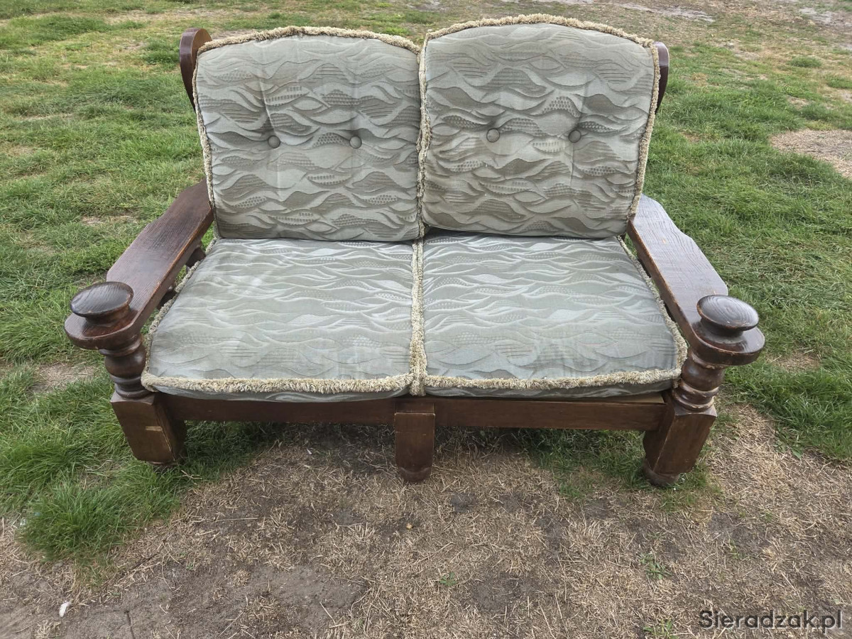 Solidna, drewniana dwuosobowa sofa w dobrym stanie. Posiada wygodne, miękkie poduszki w szarym wzorze fal. Mebel może służyć jako wygodne miejsce do siedzenia w ogrodzie, na tarasie lub w salonie.