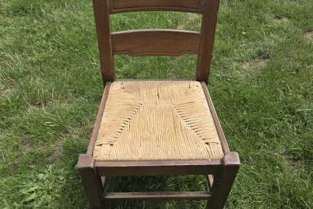 Stylowy, rustykalny drewniany fotel z plecionym siedziskiem. Posiada charakterystyczne, rzeźbione oparcie. W dobrym stanie, nadaje się do wykorzystania w ogrodzie lub na tarasie jako część wiejskiego, przytulnego wystroju.