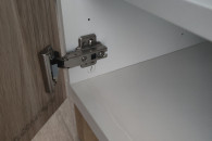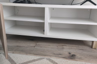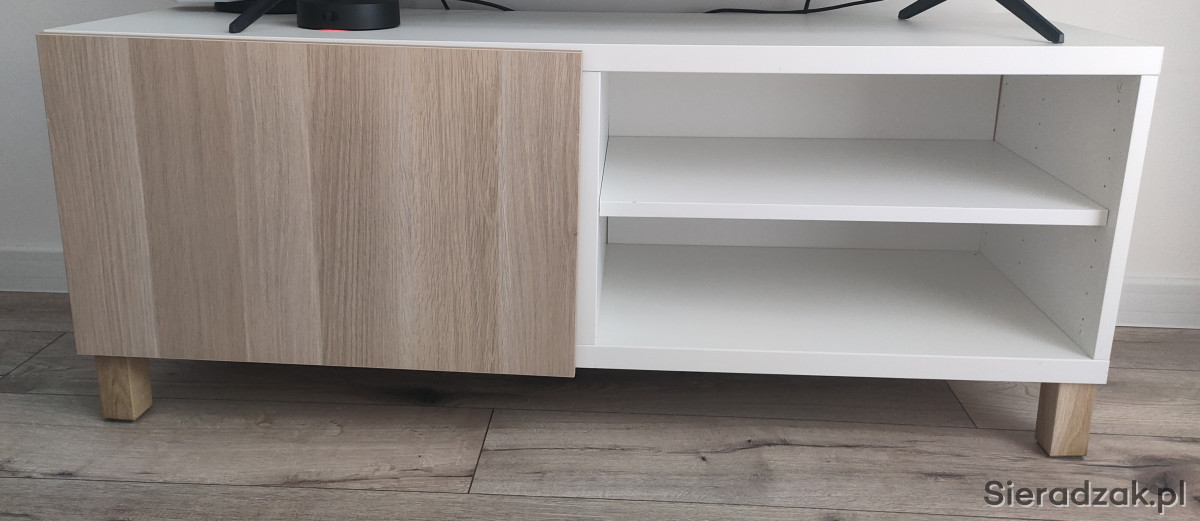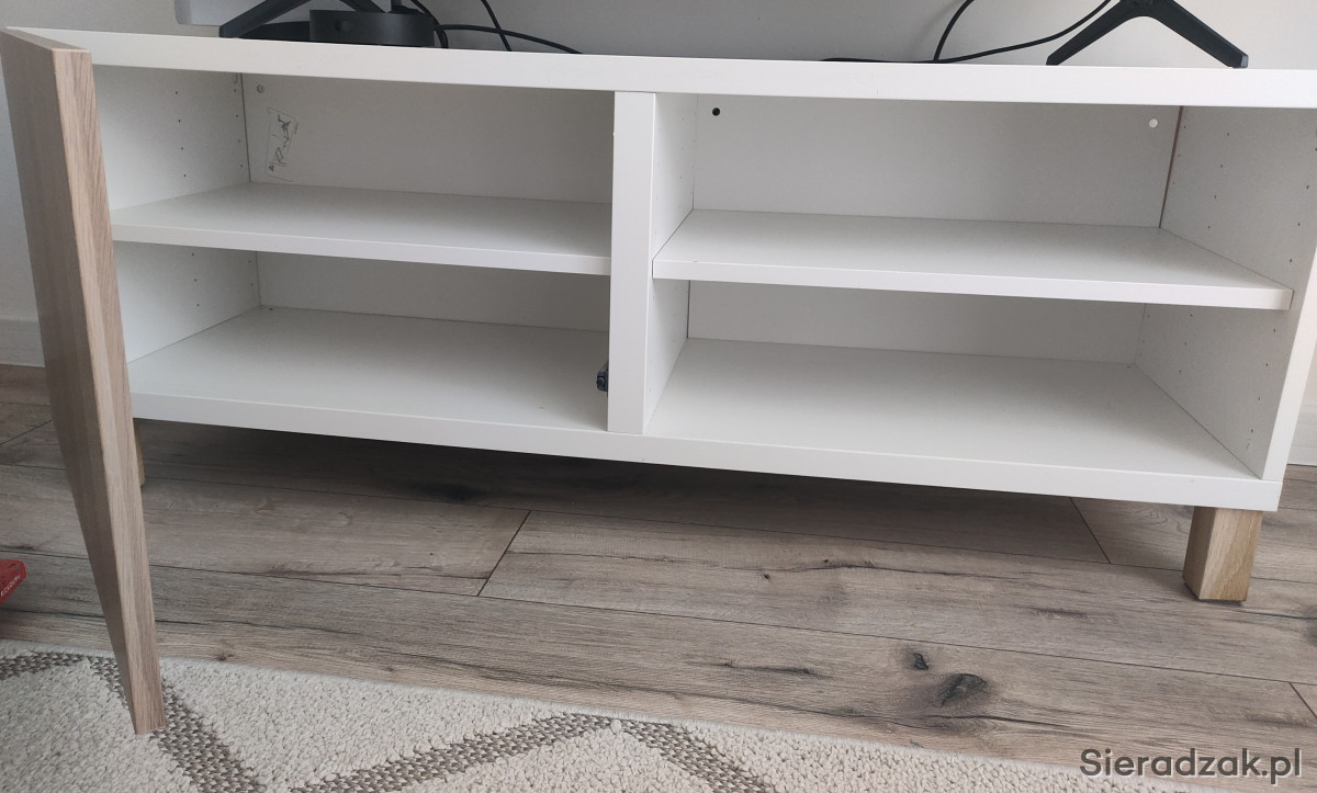 Biała szafka RTV z drzwiczkami, o wymiarach wysokość 48cm, szerokość 120cm, głębokość 40cm. Stan bardzo dobry, z niewielkimi uszkodzeniami widocznymi na zdjęciach.