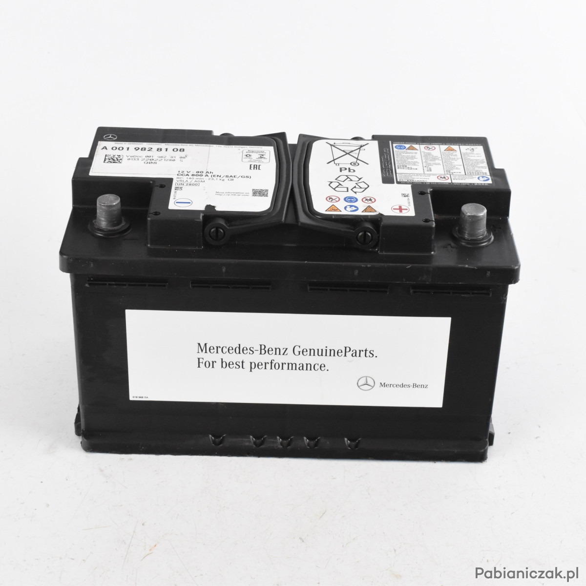 Akumulator A0019828108 (kod producenta) to oryginalna bateria rozruchowa przeznaczona do samochodów marki Mercedes-Benz, wykonana w technologii AGM (Absorbent Glass Mat), stosowana fabrycznie w wielu modelach tej marki.