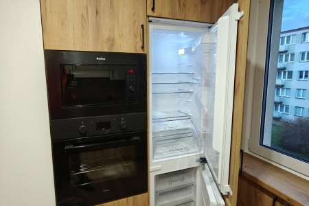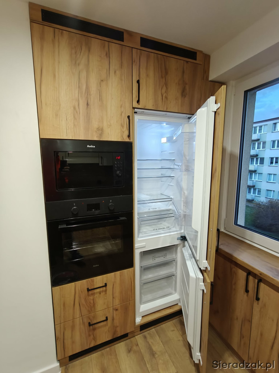 Kuchnia wykonana na wymiar przez stolarza: pełna zabudowa, sprzęt AGD + RTV w cenie (zmywarka w zabudowie, lodówka w zabudowie, mikrofala w zabudowie, płyta indukcyjna, okap, piekarnik, oświetlenie led).