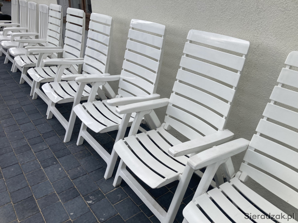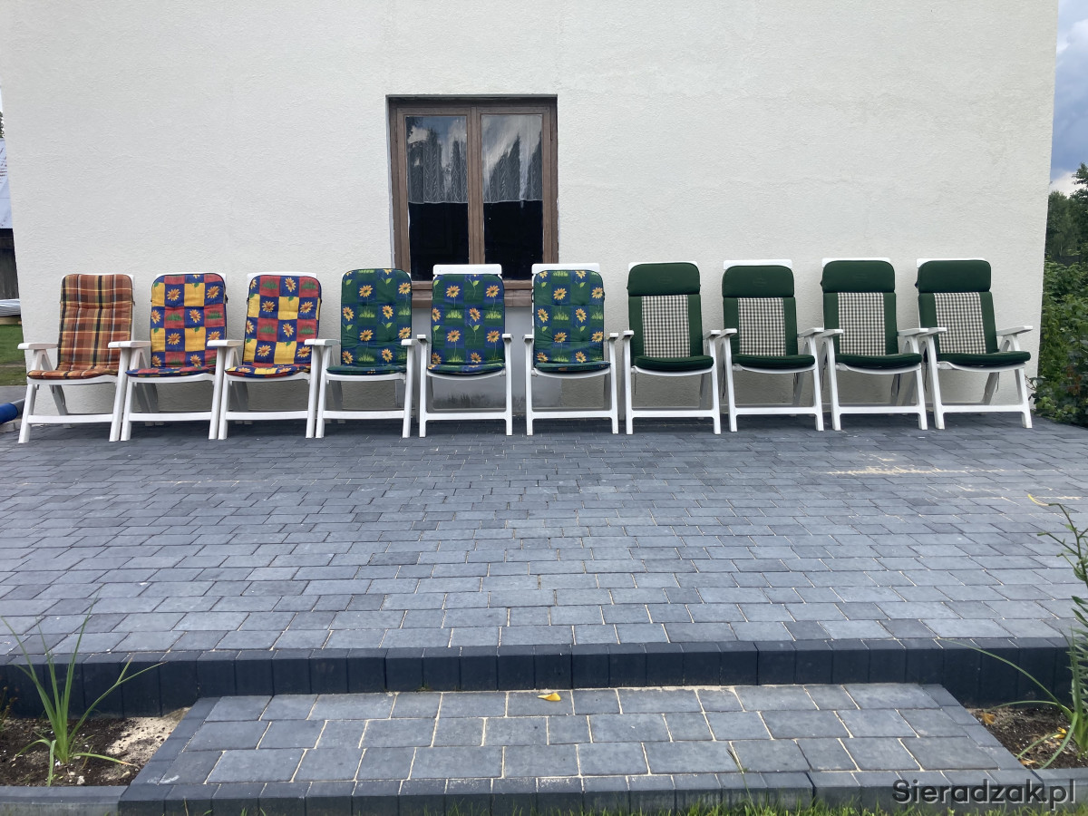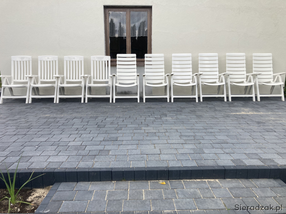 Wygodne, białe i rozkładane krzesła ogrodowe, idealne do wypoczynku na świeżym powietrzu. Wykonane z trwałych materiałów, zapewniają komfort i relaks w Twoim ogrodzie lub na tarasie. Zestaw składa się z 10 sztuk krzeseł (6 + 4 szt), w bardzo dobrym stanie technicznym, bez uszkodzeń, bez połamań.