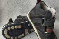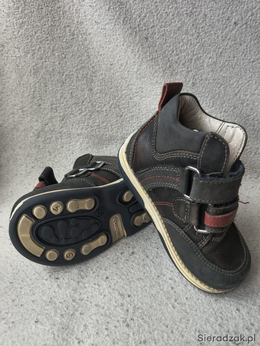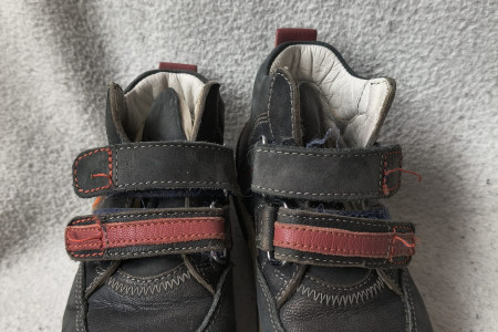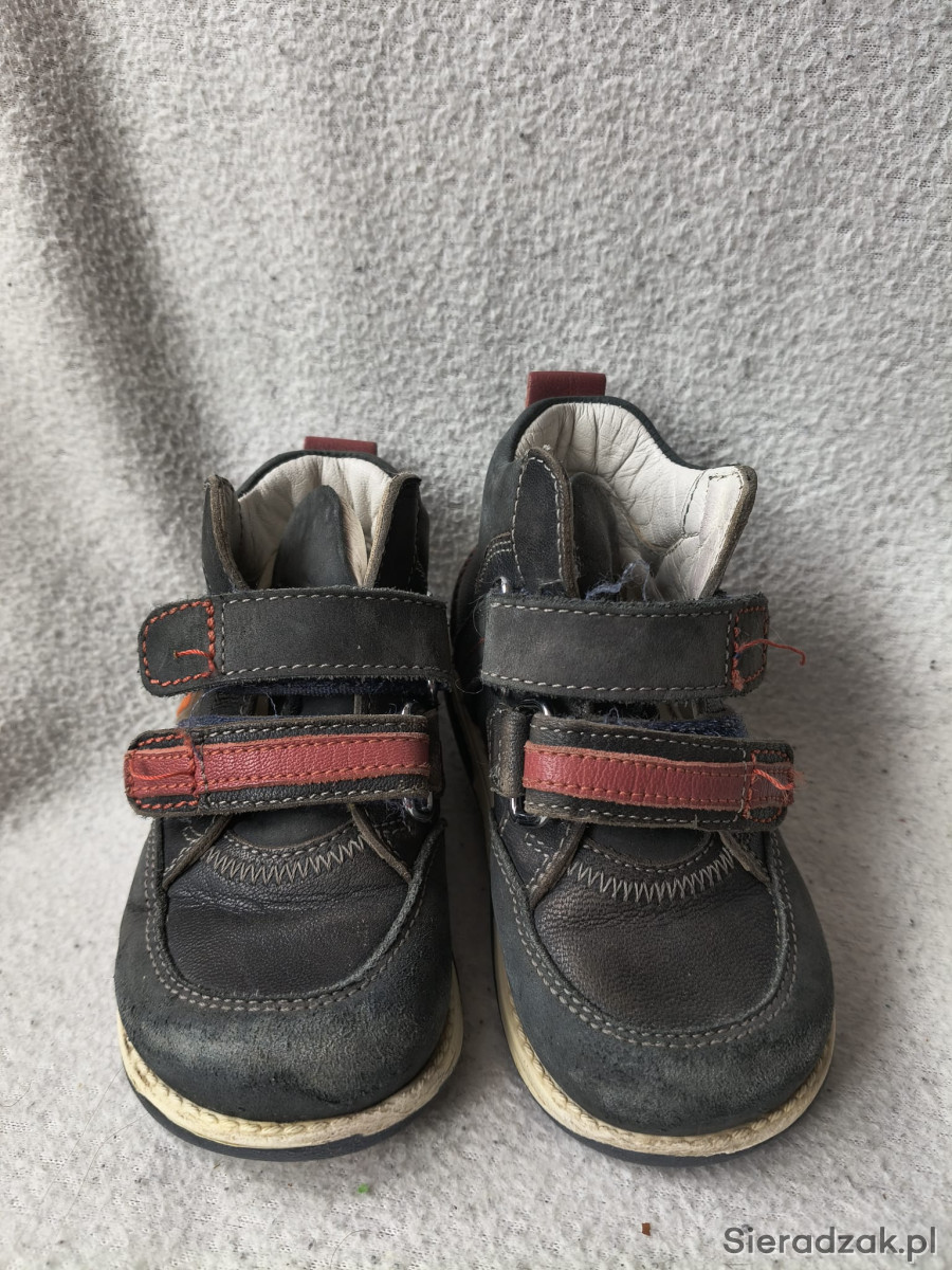 Buty po jednym dziecku, są bardzo solidne, skórzane, z usztywnionym zapiętkiem, noszą ślady użytkowania, pościerne głównie na czubkach.