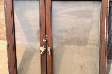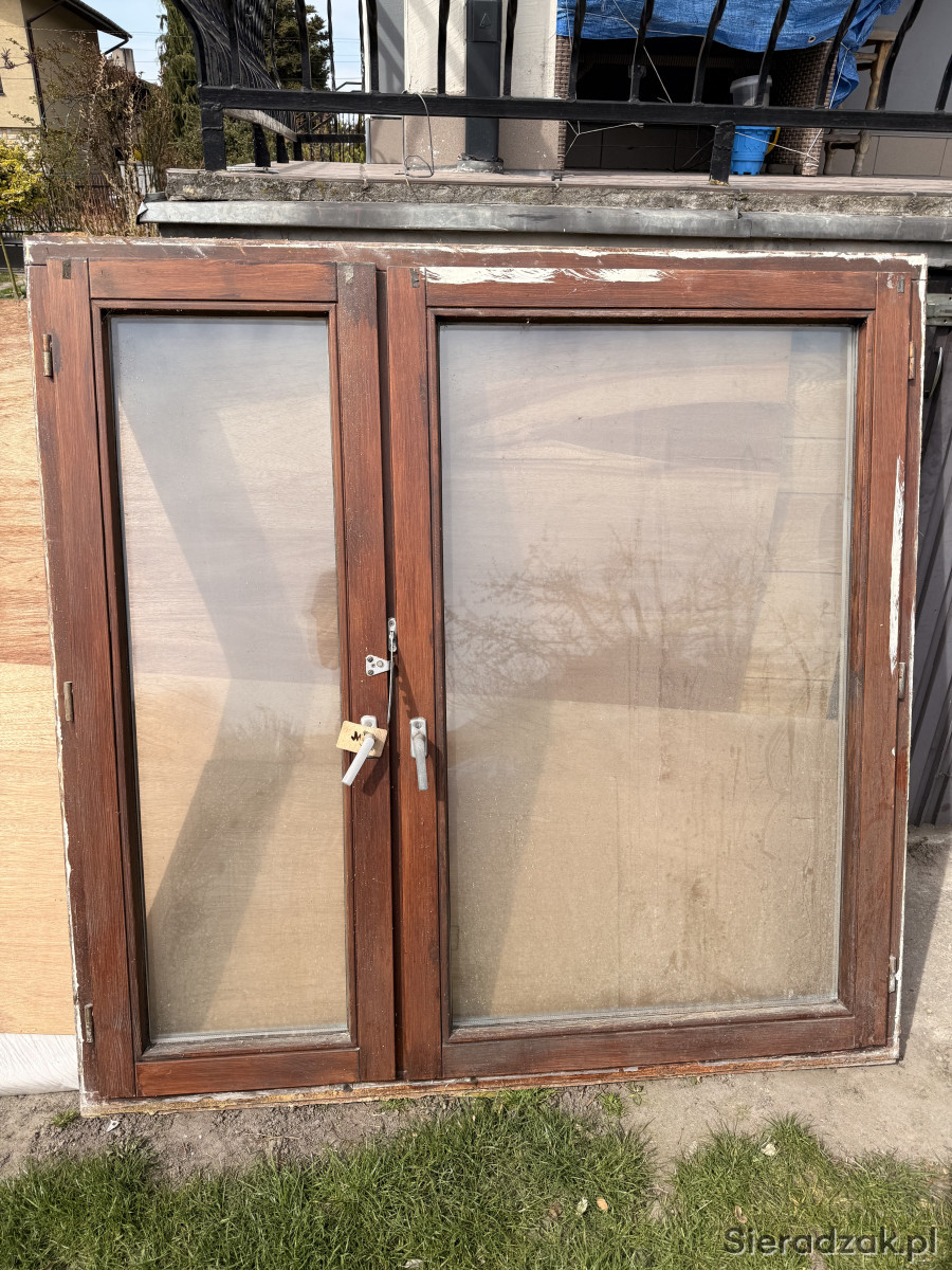 Stare drewniane okno w wymiarach około 140cm szerokie, 170cm wysokie