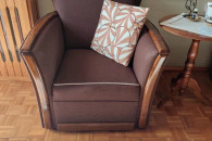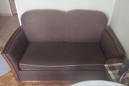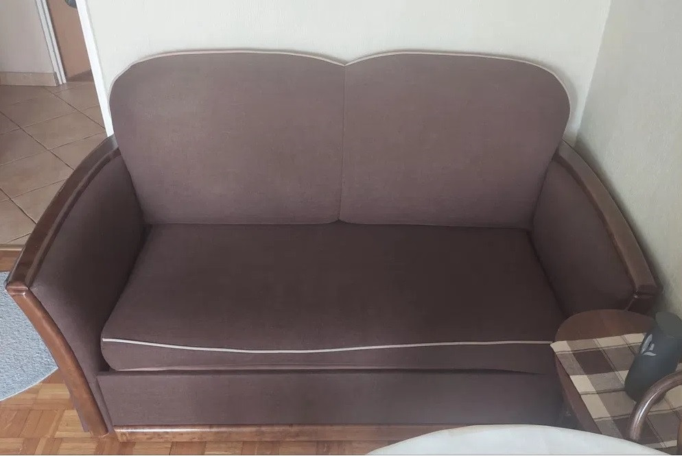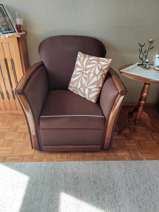 Zestaw sofy i fotela w bardzo dobrym stanie. Mebel tapicerowany w kolorze brązowym, wykonany z drewna. Doskonały do salonu lub sypialni. Sofa z funkcją spania.