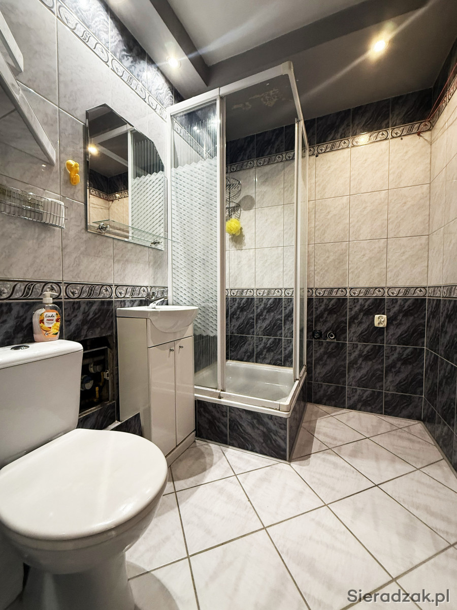 - łazienka z wc; wyposażona w kabinę prysznicową; brak bojlera - ciepła woda z sieci; na podłogach i ścianach glazura starszego typu ale w dobrym stanie technicznym.