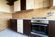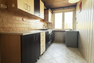 - kuchnia; oddzielne i widne pomieszczenie; na podłogach kafle, na ścianach tapety.