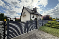 Całość posadowiona na działce 830 m2 całkowicie ogrodzonej siatką w ramach z dekoracyjnymi słupkami gabionowymi z bramą i furtką nowego typu wyposażoną w domofon i automatyczne otwieranie, dodatkowo nieruchomość wyposażona w drugą bramę z wjazdem bezpośrednio do garażu w bryle budynku.