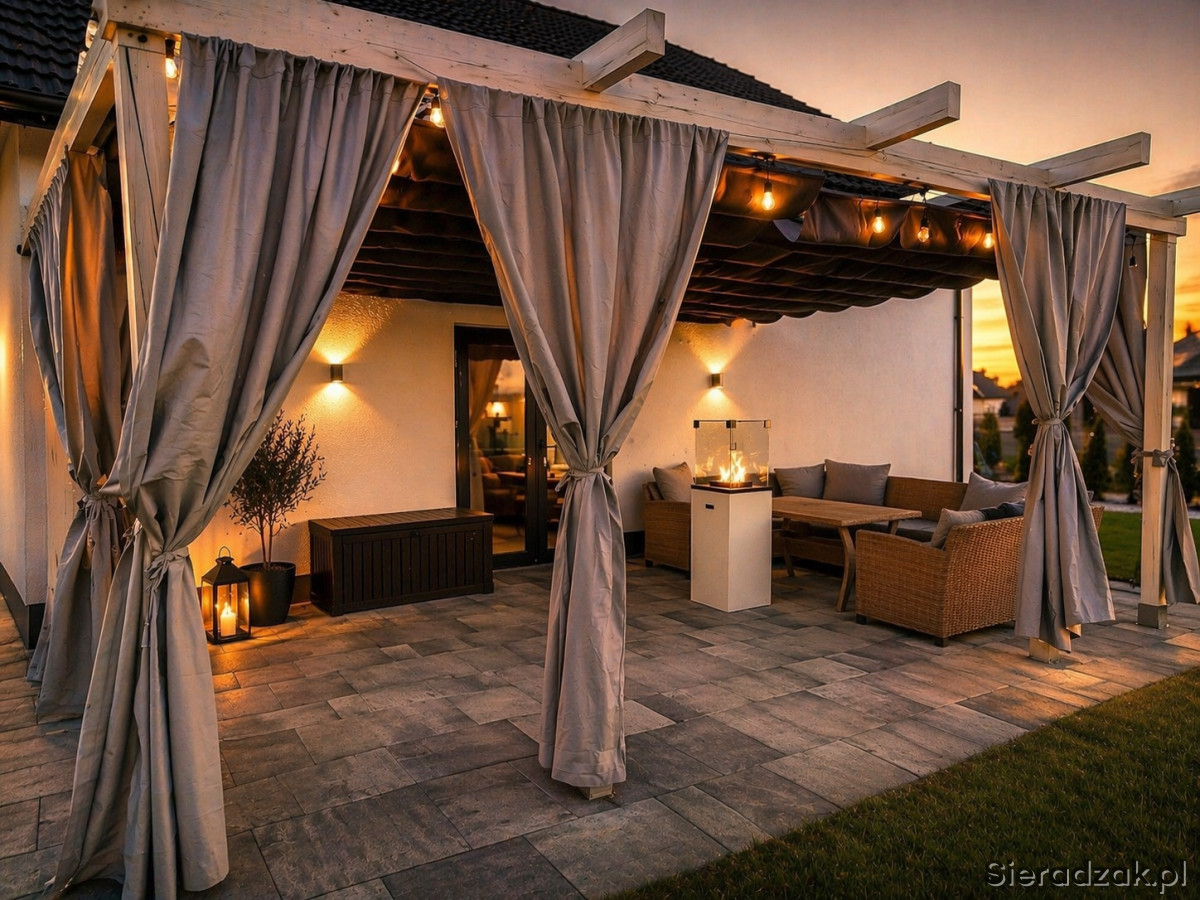 Pergola jest zanotowana do ściany domu. Na górnej części zamontowane są 2 rolety rzymskie, stanowią one zadaszenie całej powierzchni pergoli, dodatkowo w komplecie 6 zasłon szytych na miarę. Całość prezentuje się znakomicie. Koszt całej pergoli to 10 tys -