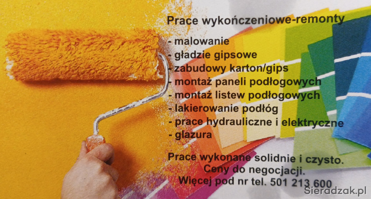 Wykonam usługi remontowe- malowanie, gładzie, układanie glazury, paneli podlogowych, montaż sufitów podwieszanych, ścianki z k/g i inne. Ceny do negocjacji, wycena gratis. Atrakcyjne ceny