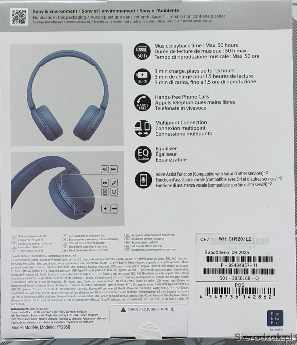 Projektanci sprzętu Sony troszczą się nie tylko o styl, lecz i środowisko naturalne. Słuchawki WH-CH520 powstają częściowo z tworzyw sztucznych z recyklingu, a ich opakowanie jednostkowe w ogóle nie zawiera plastiku. Ten model odzwierciedla starania firmy Sony, by ograniczać wpływ produktów i działań na środowisko naturalne.