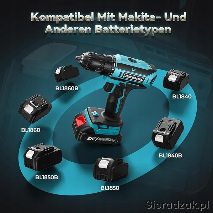 Urządzenie kompatybilne z bateriami Makita. W zestawie z wiertarko-wkrętarką 2 akumulatory i torba.