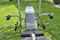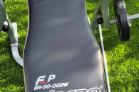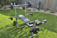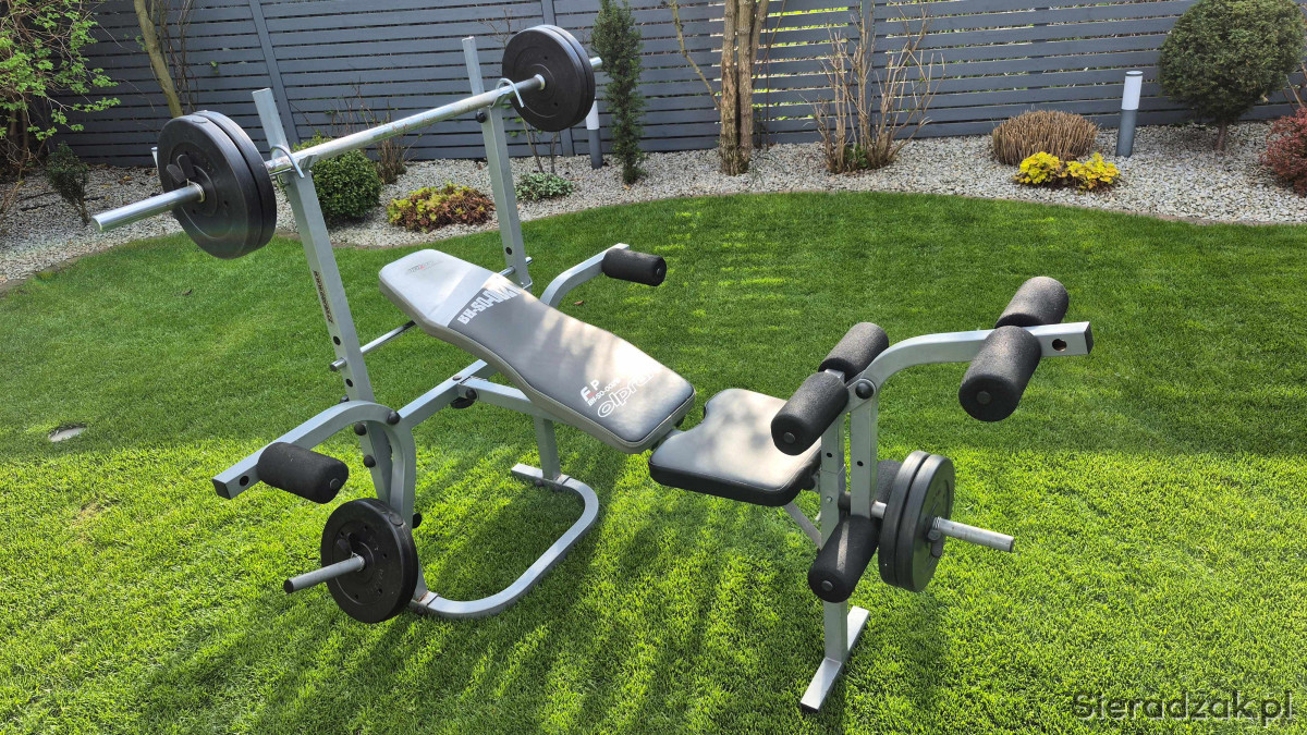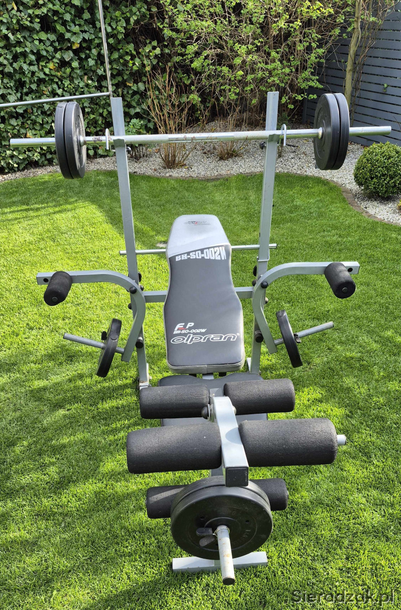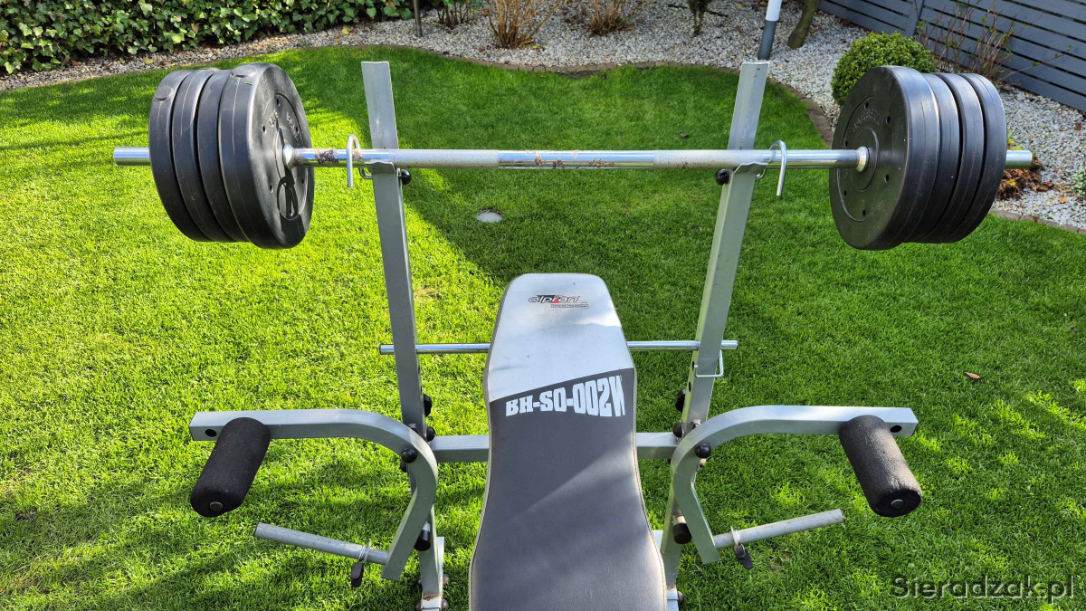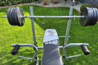 Sprzedam używaną ławkę treningową ze sztangą i obciążeniem bitumicznym (25kg).