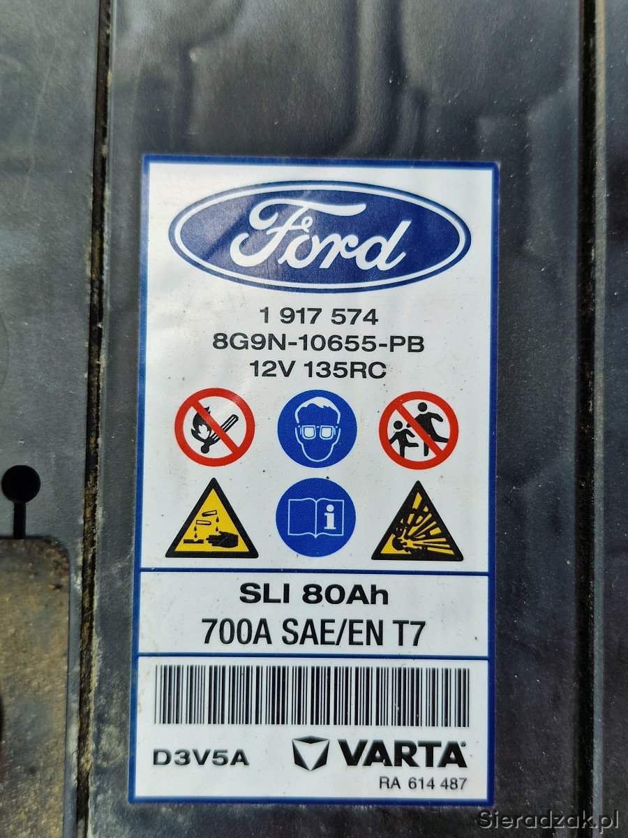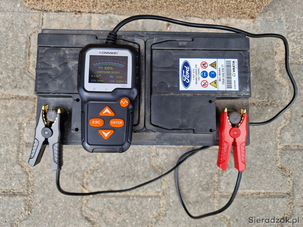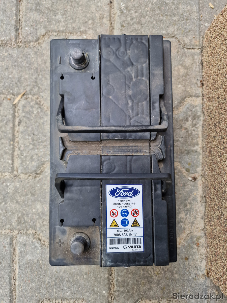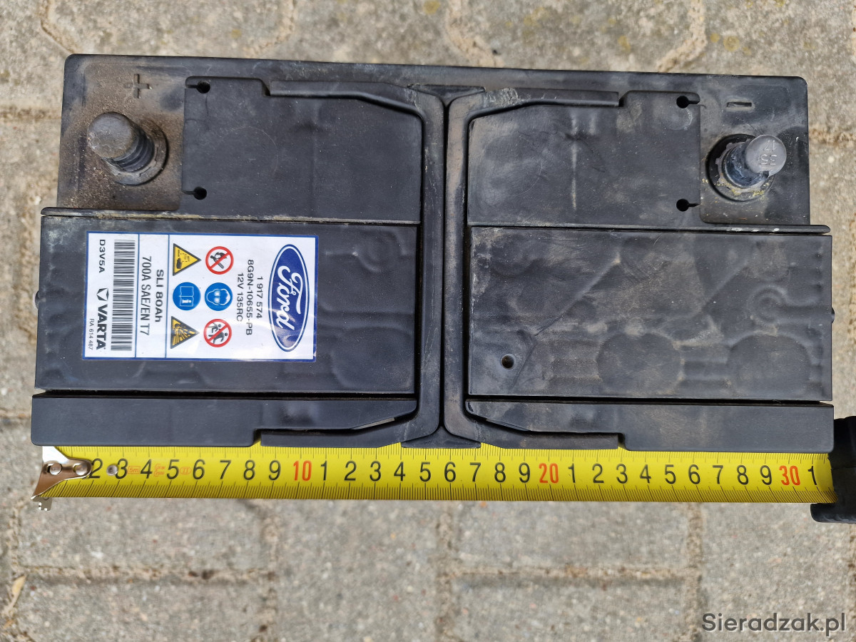 Sprzedam używany akumulator Ford / Varta SLI 12V 80Ah 700A EN T7, klasyczny akumulator kwasowo-ołowiowy, polaryzacja: prawy plus. Akumulator salonowy, od nowości używany w Ford Focus MK3 1,5 Diesel, tzn. od 2017 r. Cały czas sprawował się bez problemów jednak podczas znacznych mrozów tej zimy jego pojemność była znacznie obniżona, tak że po kilku rozruchach rozładowywał się. Pomiary na zdjęciach wykonane testerem Konnwei KW650, po 24h od pełnego naładowania, przy temperaturze zewnętrznej 18 st. C: napięcie 12,67V, SOC (stan naładowania) 100%, SOH („zdrowie”) 74%, prąd rozruchowy 521A, rezystancja wewnętrzna 5,14 mOhm. Obudowa cała, stan wizualny jak na zdjęciach. Wymiary: 31,5 cm x 17 cm x 17 cm. Masa: 19,25 kg. Dostępny odbiór osobisty w Łodzi ul. Obywatelska, w Sieradzu ul. Powstańców Warszawy (po uzgodnieniu) oraz wysyłka.