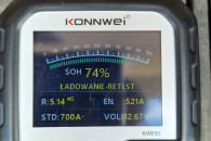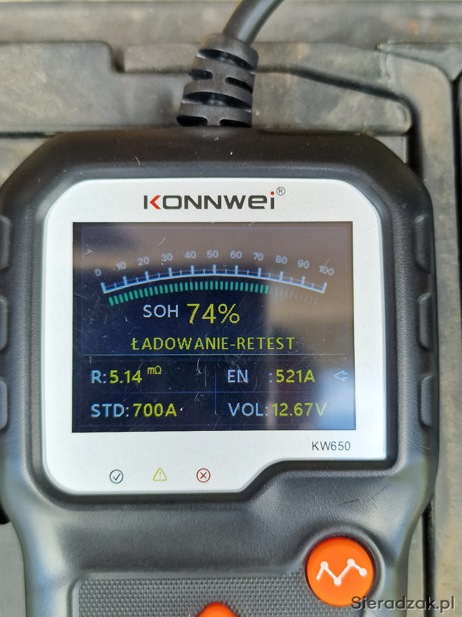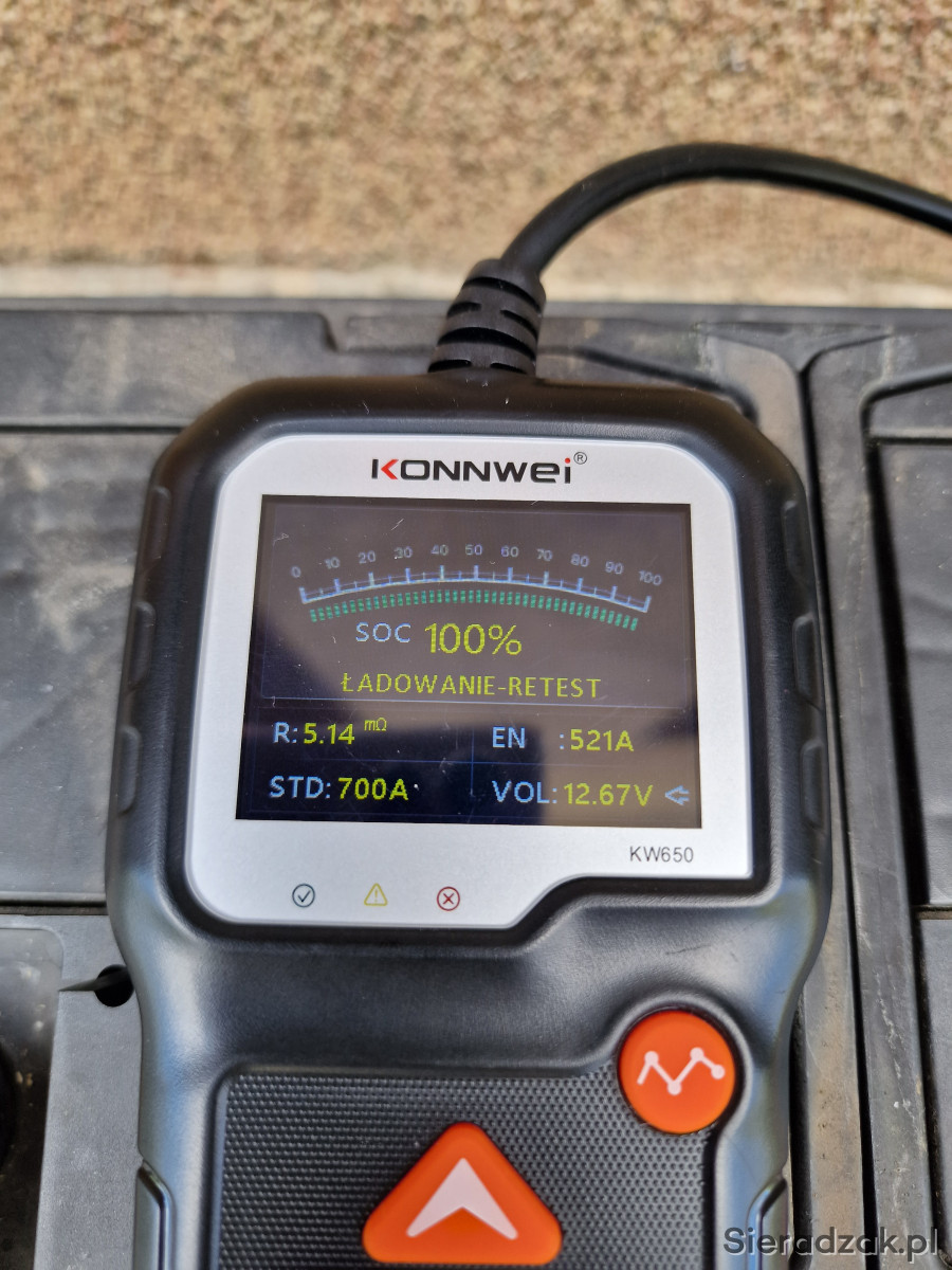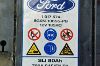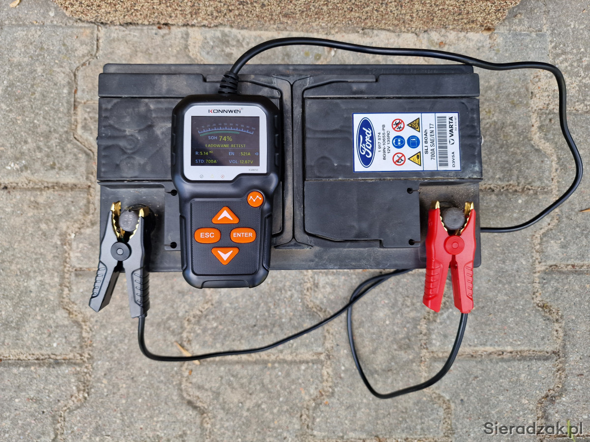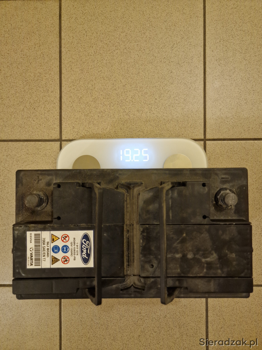 Sprzedam używany akumulator Ford / Varta SLI 12V 80Ah 700A EN T7, klasyczny akumulator kwasowo-ołowiowy, polaryzacja: prawy plus. Akumulator salonowy, od nowości używany w Ford Focus MK3 1,5 Diesel, tzn. od 2017 r. Cały czas sprawował się bez problemów jednak podczas znacznych mrozów tej zimy jego pojemność była znacznie obniżona, tak że po kilku rozruchach rozładowywał się. Pomiary na zdjęciach wykonane testerem Konnwei KW650, po 24h od pełnego naładowania, przy temperaturze zewnętrznej 18 st. C: napięcie 12,67V, SOC (stan naładowania) 100%, SOH („zdrowie”) 74%, prąd rozruchowy 521A, rezystancja wewnętrzna 5,14 mOhm. Obudowa cała, stan wizualny jak na zdjęciach. Wymiary: 31,5 cm x 17 cm x 17 cm. Masa: 19,25 kg. Dostępny odbiór osobisty w Łodzi ul. Obywatelska, w Sieradzu ul. Powstańców Warszawy (po uzgodnieniu) oraz wysyłka.
