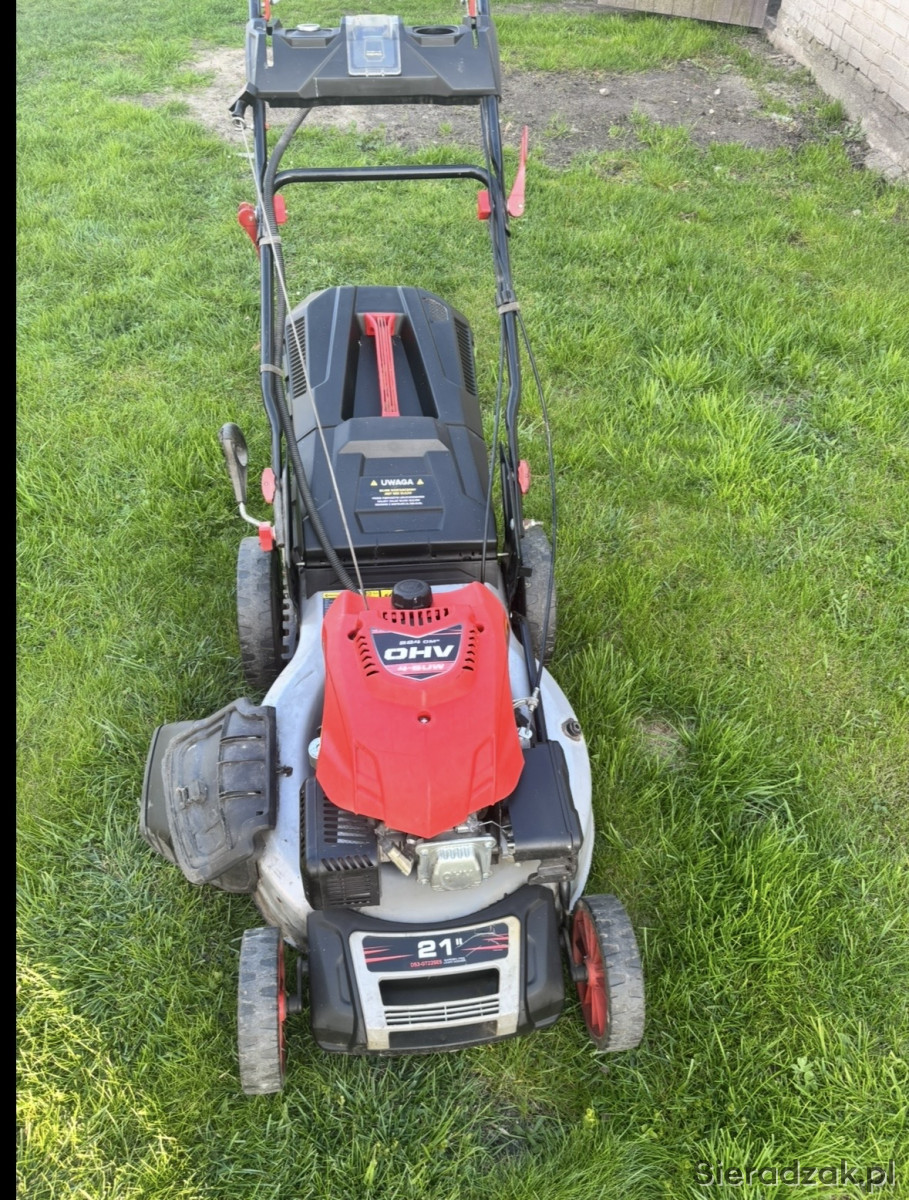 Sprzedam solidną kosiarkę spalinową o szerokości koszenia 21” (ok. 53 cm). Wyposażona w wydajny silnik OHV 4,5 kW, który bez problemu radzi sobie nawet z gęstą trawą.