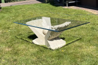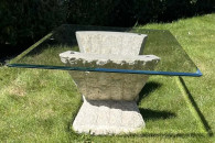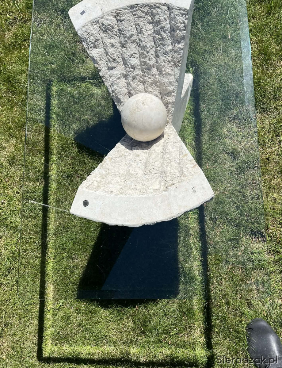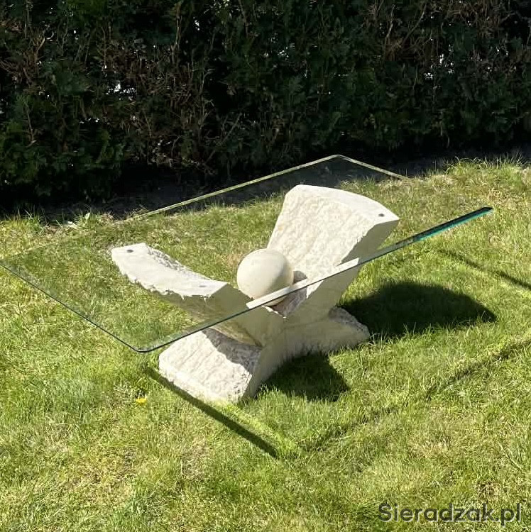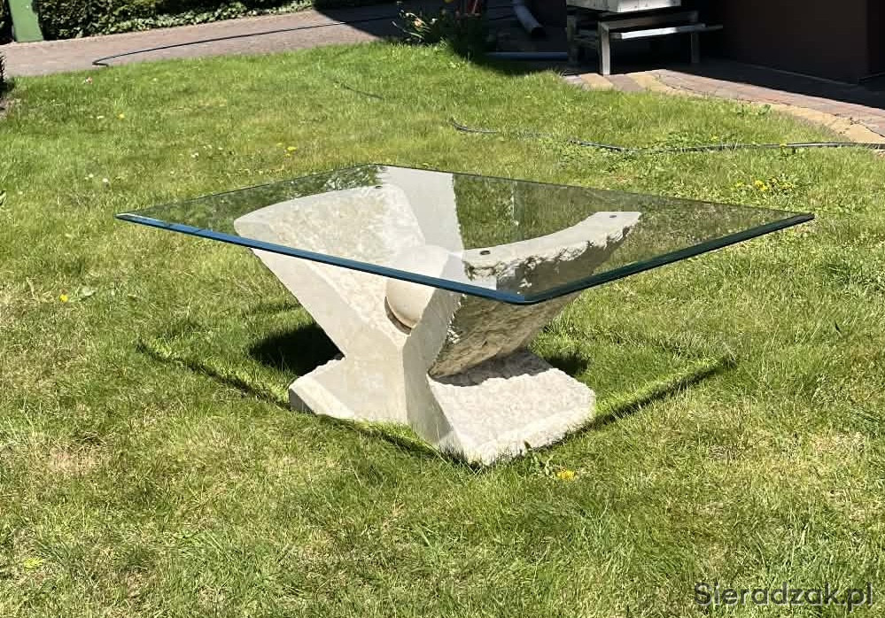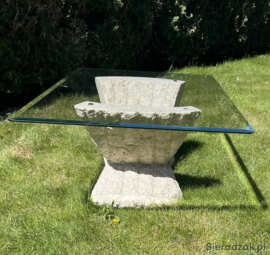 Solidny, szklany stolik kawowy na podstawie kamiennej. Podstawa wykonana z kamienia, szkło grube hartowane szlifowane dookoła. Wymiary stolika: 120 x 70cm i 42 cm wysokości.